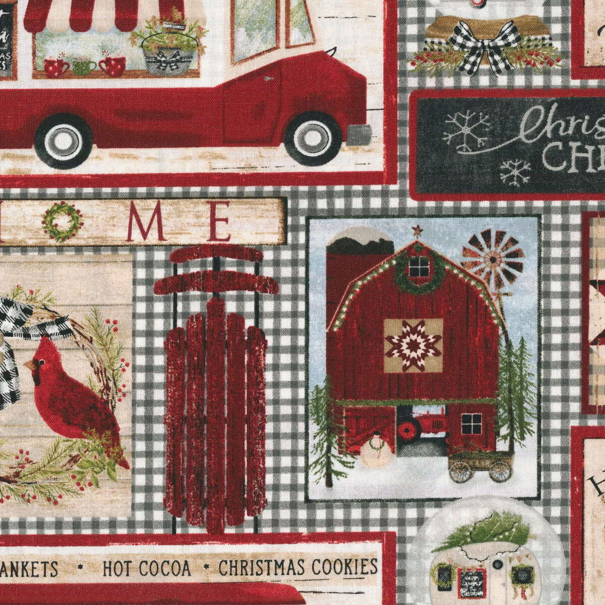 A Christmas to Remember is a holiday fabric collection by Beth Albert for 3 Wishes featuring classic Christmas motifs such as snowmen, vintage trucks, Christmas trees, and Santa being pulled by reindeer! Decorate for the holidays with this vintage patchwork fabric!