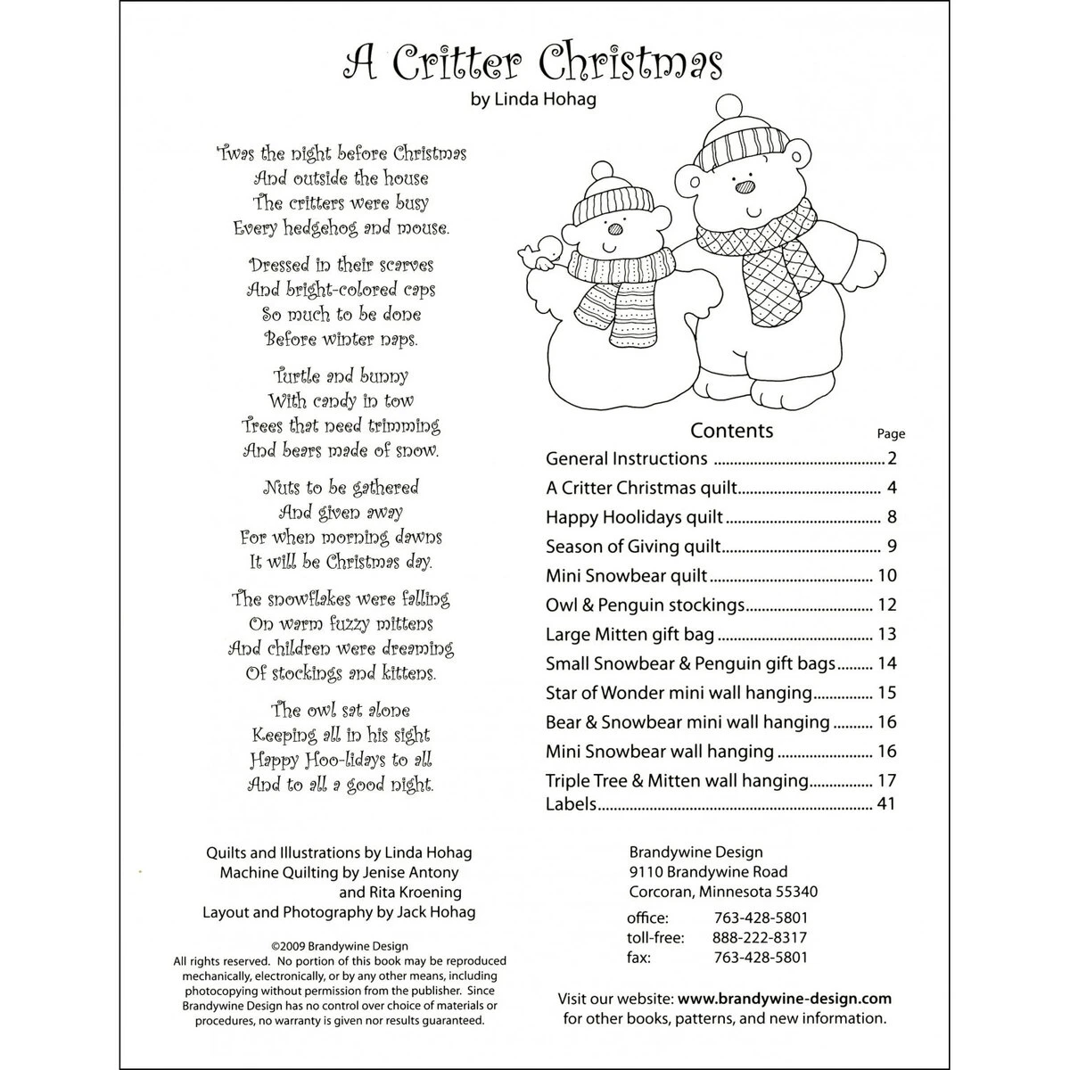 A Critter Christmas is a 44 page full color book of 11 projects including A Critter Christmas Quilt, Happy Hoolidays Quilt (this not a typo… it’s a quilt with owls), Season of Giving Quilt, Mini Snowbear Quilt, Large Mitten Gift Bag, Small Snowbear & Penguin gift bags, Star of Wonder Mini Wall Hanging, Bear & Snowbear Mini Wall Hanging, Mini Snowbear Wall Hanging, and Triple Tree & Mitten Wall Hanging.