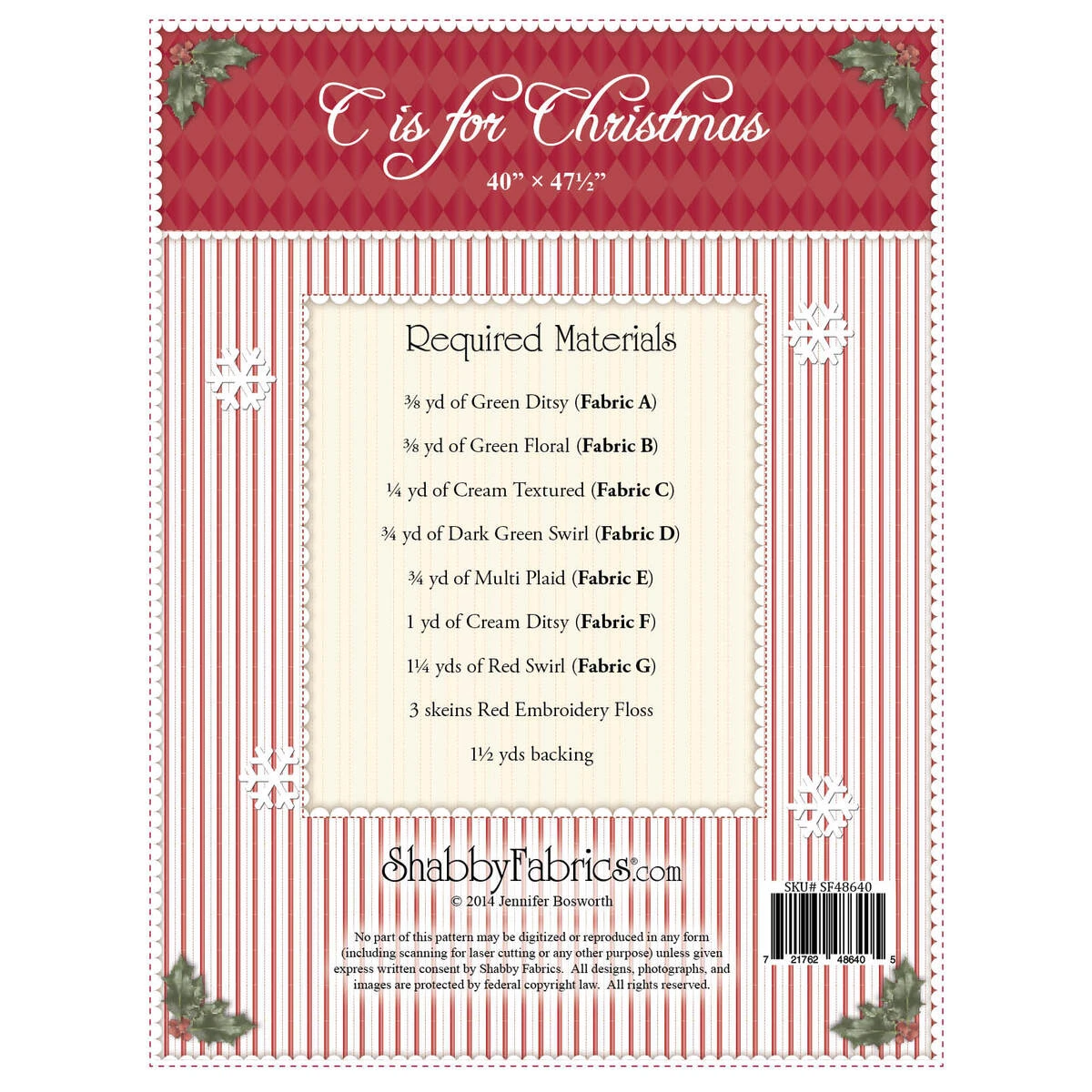 C is for Christmas is a 39″ x 46″ holiday quilt designed right here at Shabby Fabrics. The quilt features ten hand embroidered redwork blocks, nine appliqued letters spelling the word “CHRISTMAS” and one pieced star block. A sashing of hourglass blocks in creams, reds, and greens are showcased throughout the quilt.