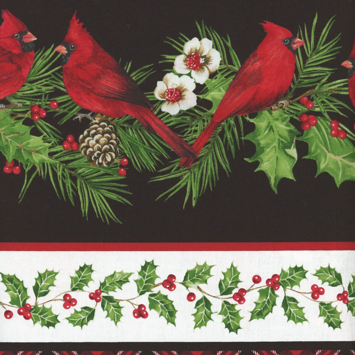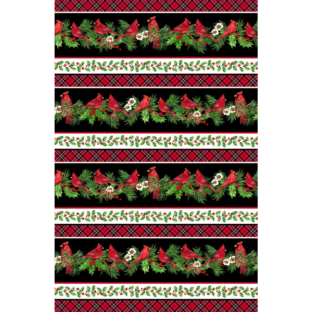 Cardinal Christmas by Deborah Edwards from Northcott Fabrics features bold reds with Christmas foliage and plaids for a cozy winter celebration! This fabric features a beautiful wall paper stripe of red cardinals, pine boughs, holly and berries, and tartan plaid on point making it a perfect choice for a border on a Christmas quilt.Â