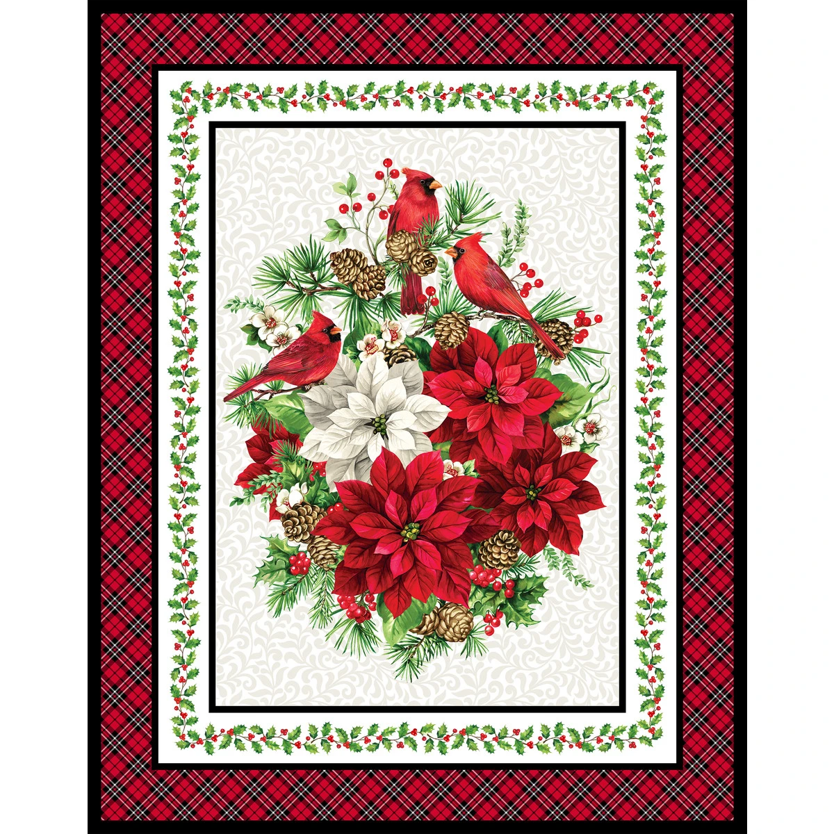 Cardinal Christmas by Deborah Edwards from Northcott Fabrics features bold reds with Christmas foliage and plaids for a cozy winter celebration! This fabric is digitally printed, giving it brighter, more vibrant colors and beautiful detail not available in traditional, screen-printed fabrics. This panel depicts vibrant cardinals nestled among poinsettias, pine branches, holly, and delicate white flowers, all set against a serene white tonal background, while framed by festive sprigs of holly and bordered with a charming red and black plaid design. The panel measures approximately 34″ x 43″.