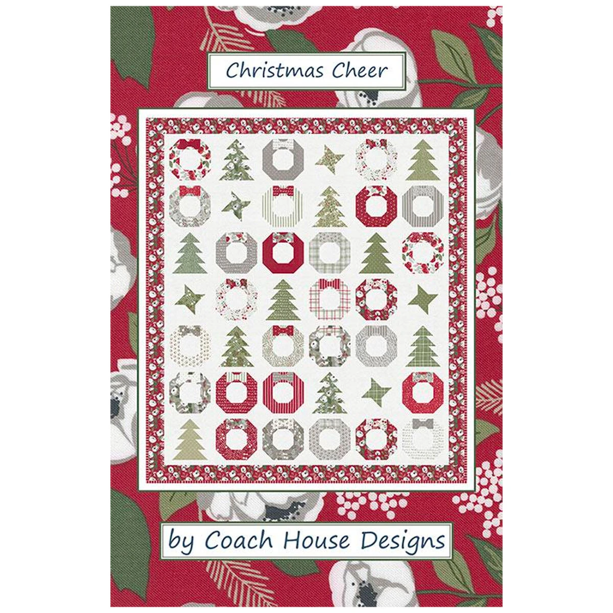 The Christmas Cheer pattern by Coach House Designs is an adorable holiday quilt. The pattern features rows of wreathes, Christmas trees, and 4-pointed stars, creating a cheerful Christmas lap quilt.
