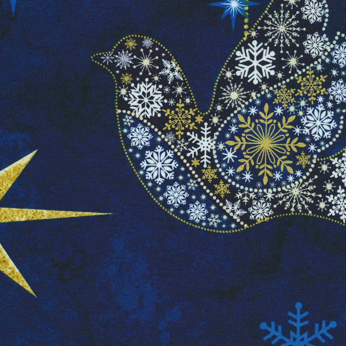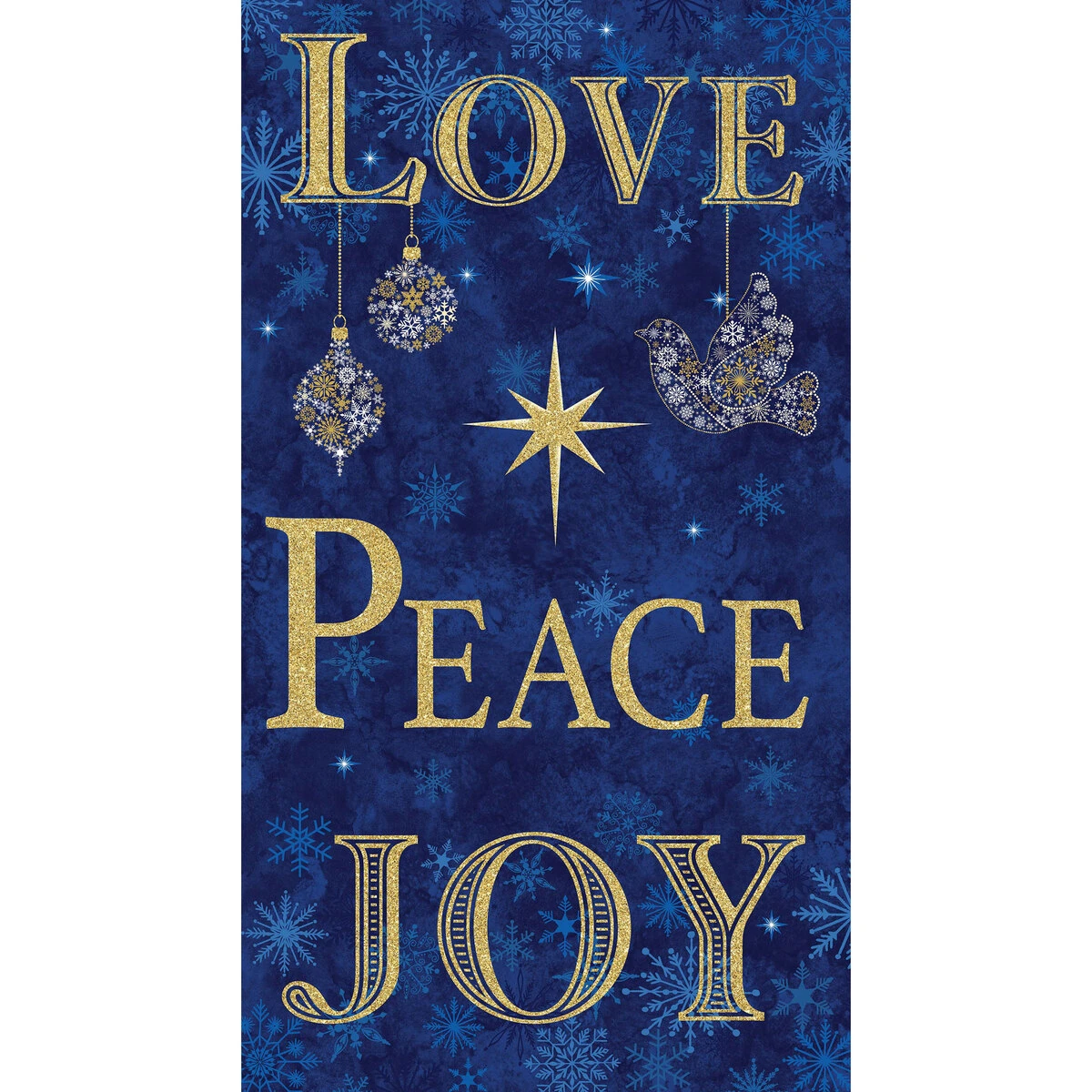 Christmas Joy – Stonehenge by Deborah Edwards and Linda Ludovico for Northcott Fabrics is a beautiful metallic Christmas collection filled with snowflake accents in red and blue colorways. This gorgeous panel features the words “Love Peace Joy”, delightful snowflakes and intricate ornaments all on a lovely blue background. This panel measures approximately 24″ x 43″.