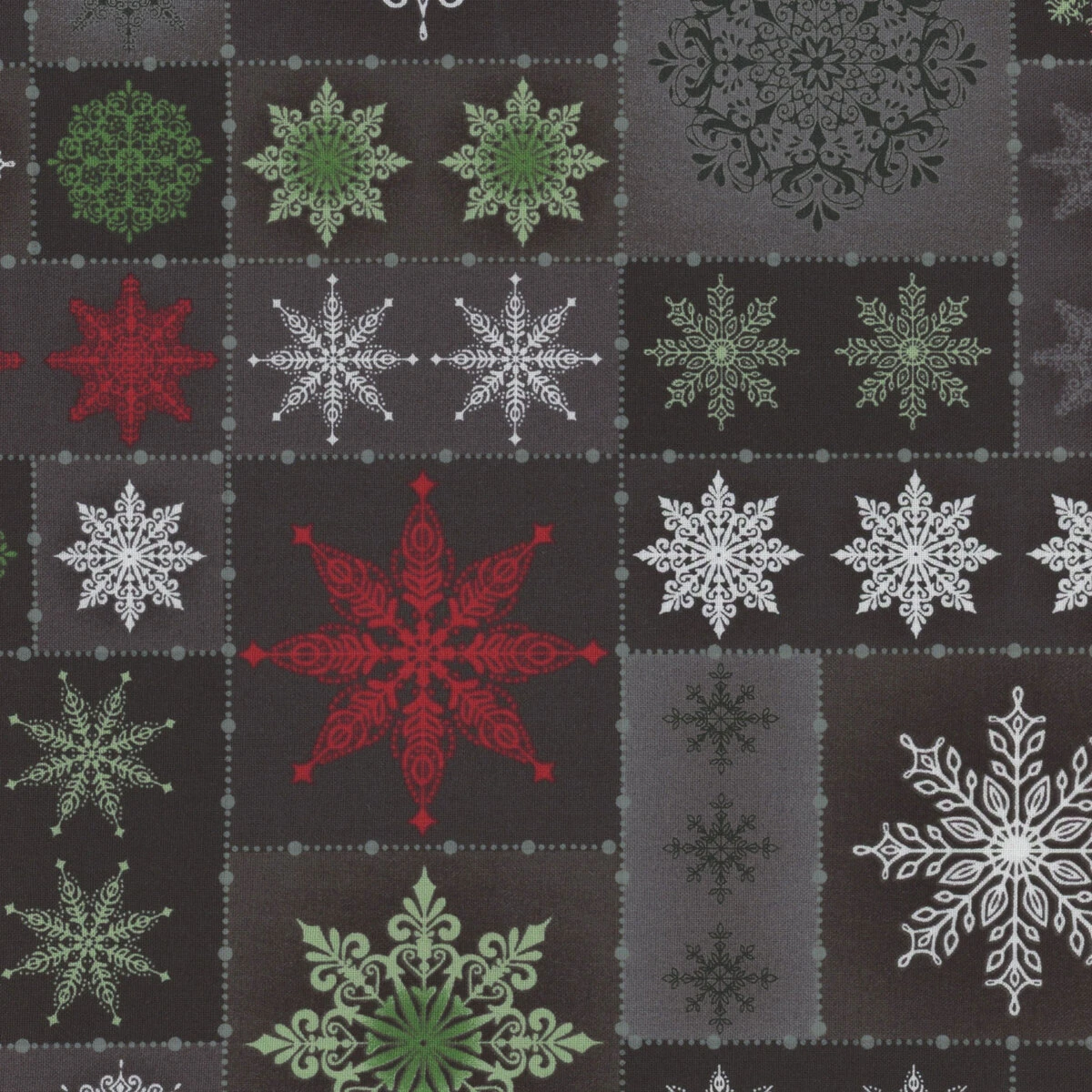 Christmas Night by Monique Jacobs for Maywood Studio is a fun Christmas collection full of plaids, snowflakes, Christmas trees all with a fun illustration style. This fabric features black and gray random squares with white and light green snowflakes.