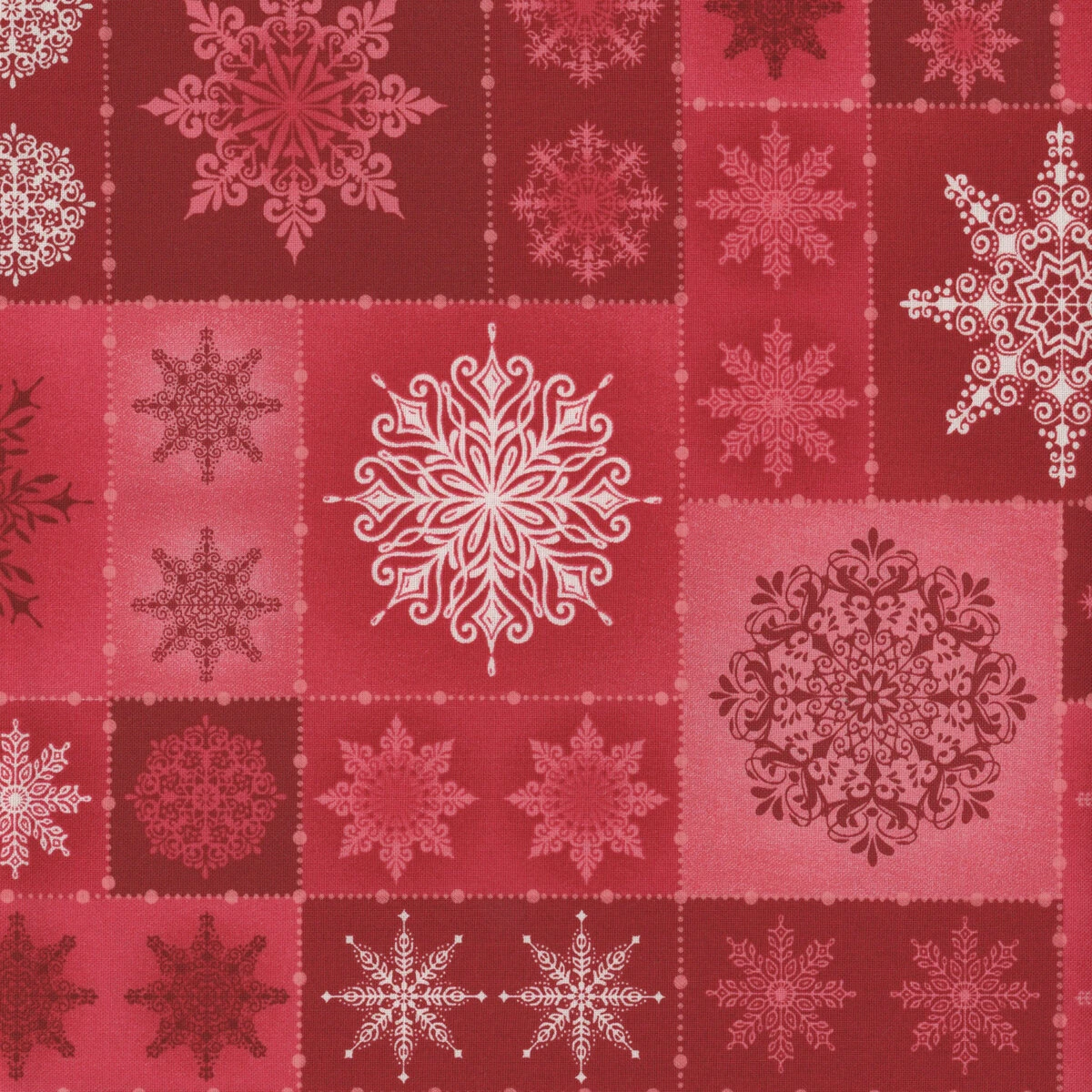 Christmas Night by Monique Jacobs for Maywood Studio is a fun Christmas collection full of plaids, snowflakes, Christmas trees all with a fun illustration style. This fabric features red random squares with white snowflakes.