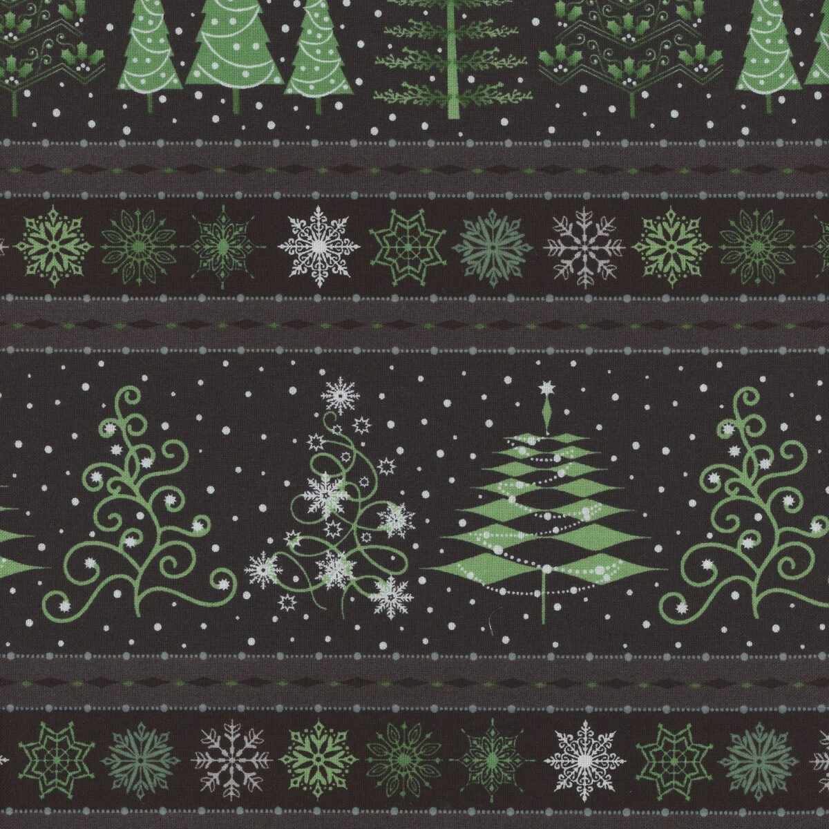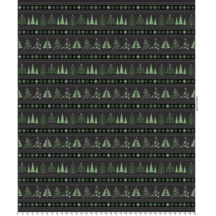 Christmas Night by Monique Jacobs for Maywood Studio is a fun Christmas collection full of plaids, snowflakes, Christmas trees all with a fun illustration style. This fabric is a border stripe with Christmas trees, snowflakes and stripes in white and light green.Â