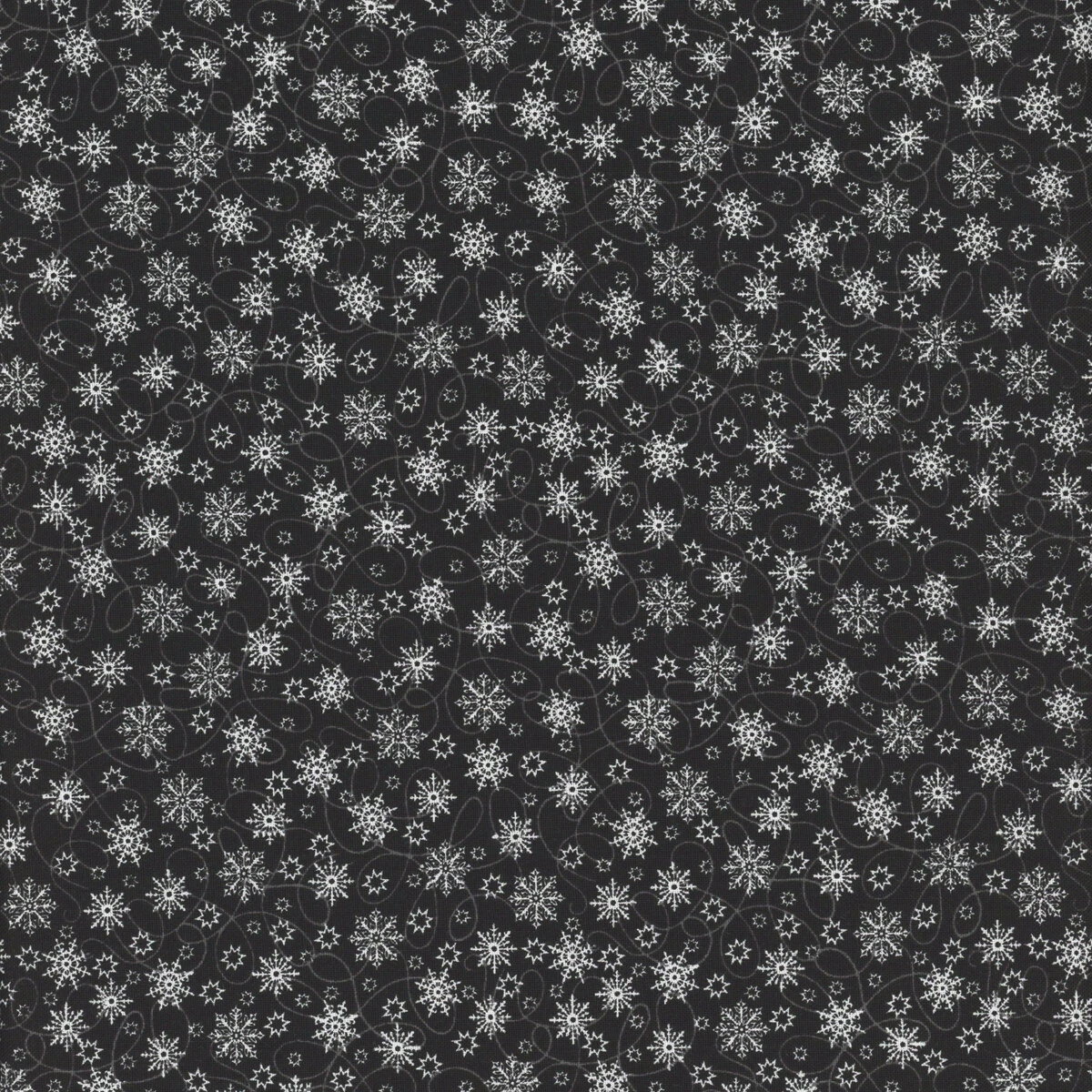 Christmas Night by Monique Jacobs for Maywood Studio is a fun Christmas collection full of plaids, snowflakes, Christmas trees all with a fun illustration style. This fabric features white snowflakes and gray scrolls with a black background.