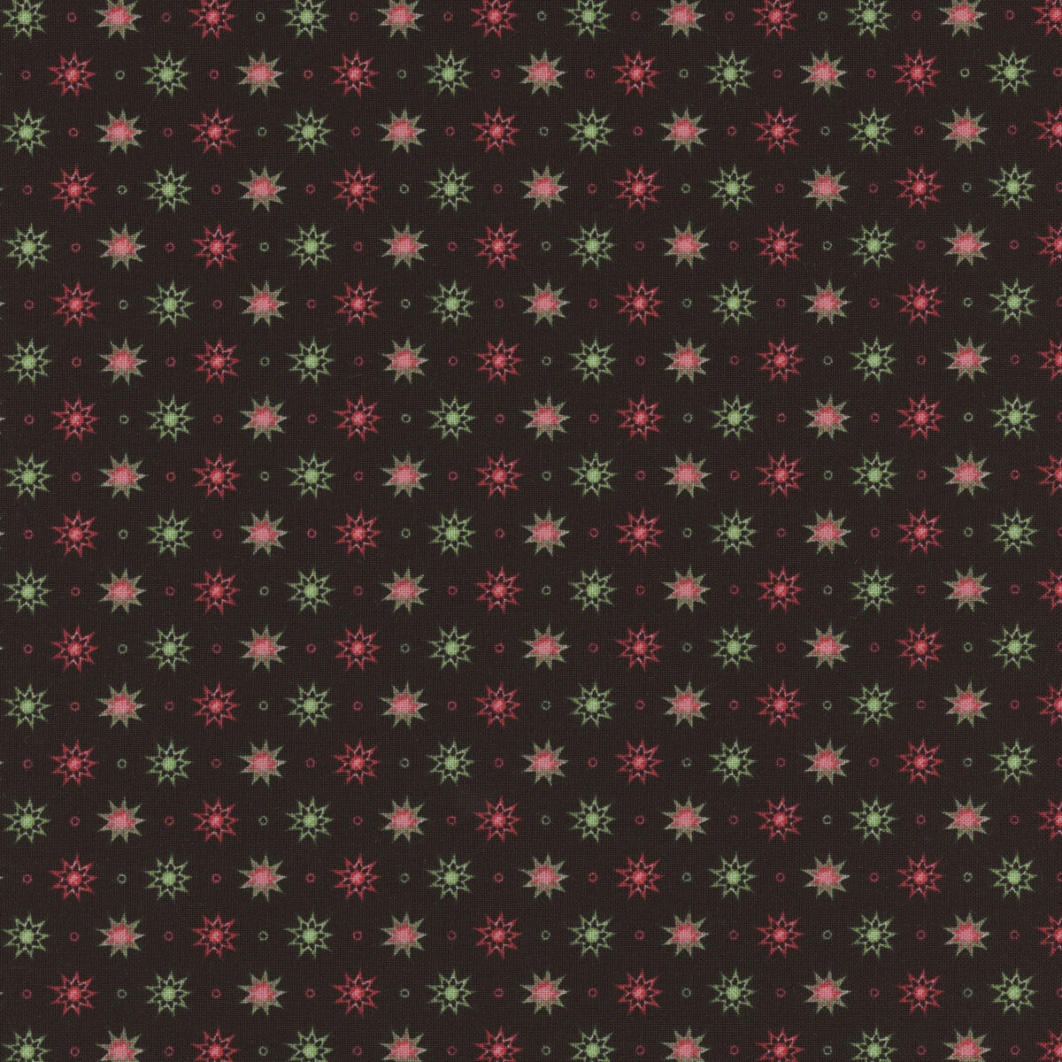 Christmas Night by Monique Jacobs for Maywood Studio is a fun Christmas collection full of plaids, snowflakes, Christmas trees all with a fun illustration style. This fabric features red and green abstract pointy stars on a solid black background.