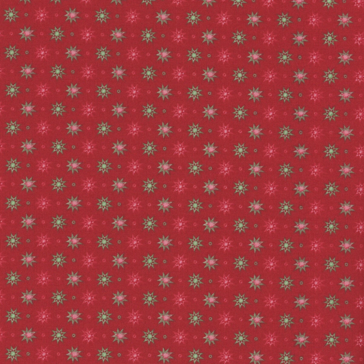 Christmas Night by Monique Jacobs for Maywood Studio is a fun Christmas collection full of plaids, snowflakes, Christmas trees all with a fun illustration style. This fabric features red and green abstract pointy stars on a solid bright red background.Â