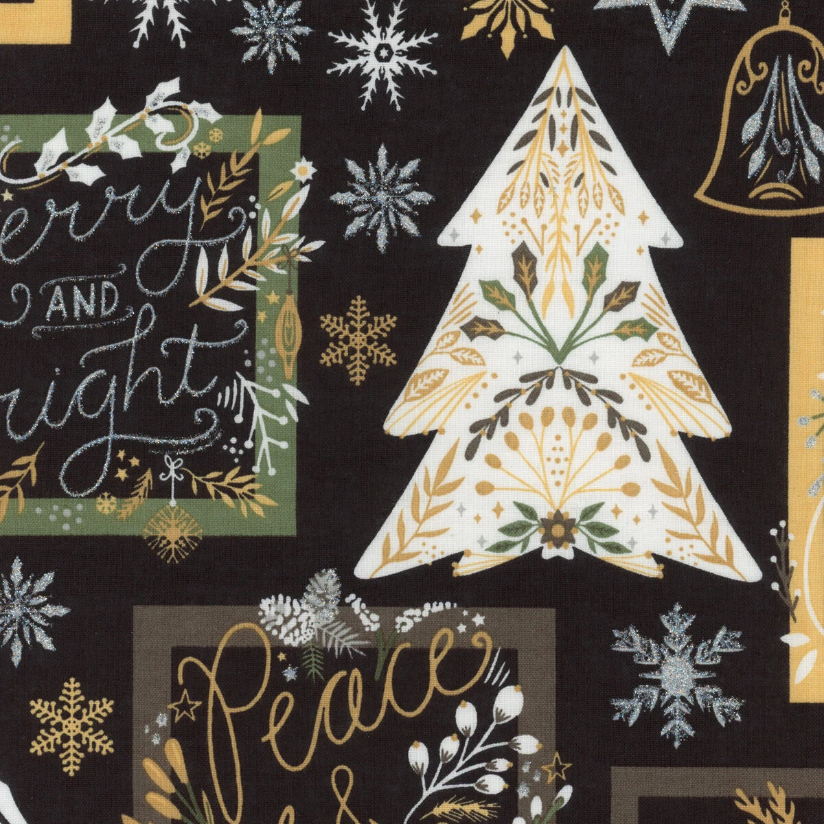 Christmas Shine by Louise Allen for 3 Wishes Fabrics is a beautiful black, white, and gray Christmas fabric collection with splashes of color and glitter accents. Add a unique look to your next Christmas fabric with this print featuring reindeer, snowflakes, Christmas phrases, and pine trees with glitter accents on a black background.