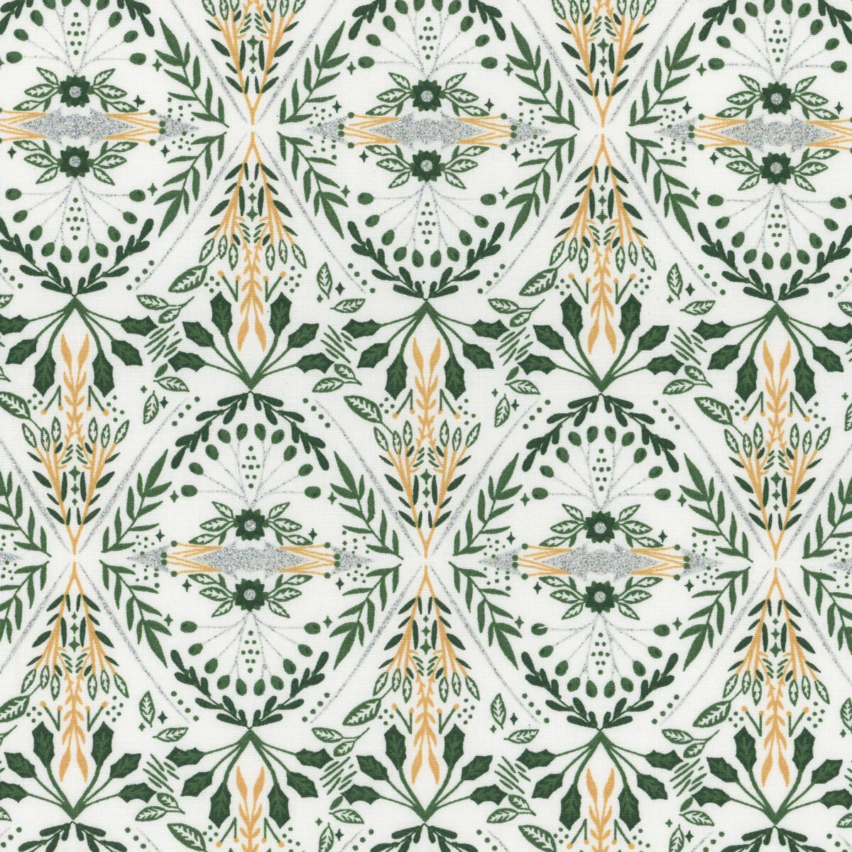 Christmas Shine by Louise Allen for 3 Wishes Fabrics is a beautiful black, white, and gray Christmas fabric collection with splashes of color and glitter accents. Add a unique look to your next Christmas fabric with this print featuring mirrored leaves and trees all over a white background.