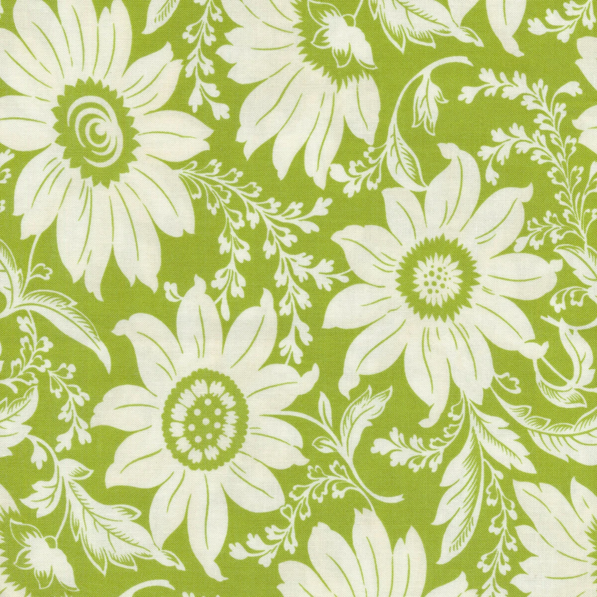 Christmas Stitched by Fig Tree & Co. from Moda Fabrics is a jolly collection featuring floral prints, damask, gingham, holly, pinecones, small homes, and The Night Before Christmas poem in classic Christmas colors. This fabric features large flowers and swirling leaves on a green background.