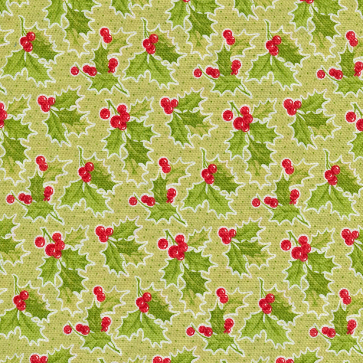 Christmas Stitched by Fig Tree & Co. from Moda Fabrics is a jolly collection featuring floral prints, damask, gingham, holly, pinecones, small homes, and The Night Before Christmas poem in classic Christmas colors. This fabric features holly, leaves, and small dots on a light green background.