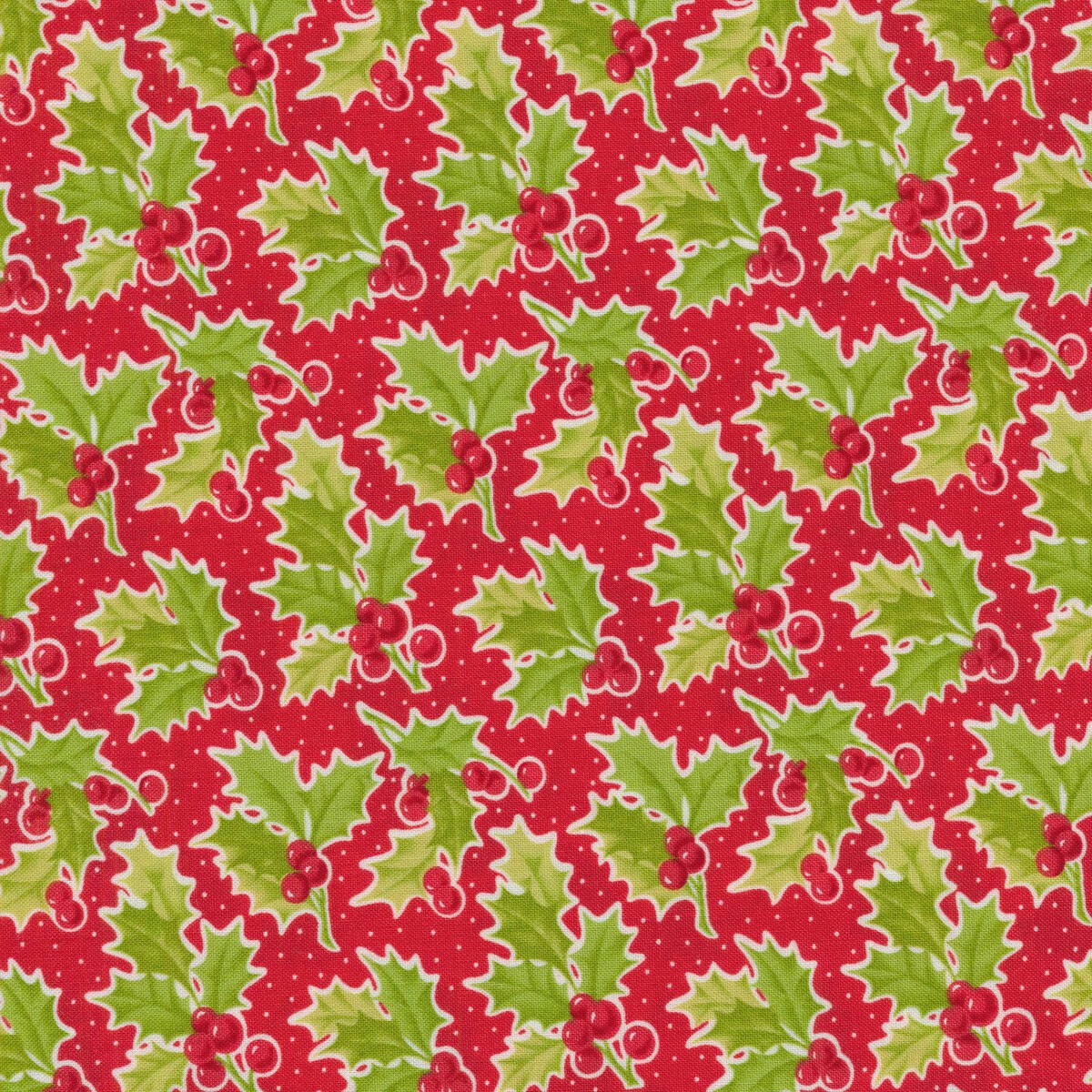 Christmas Stitched by Fig Tree & Co. from Moda Fabrics is a jolly collection featuring floral prints, damask, gingham, holly, pinecones, small homes, and The Night Before Christmas poem in classic Christmas colors. This fabric features holly, leaves, and small dots on a red background.