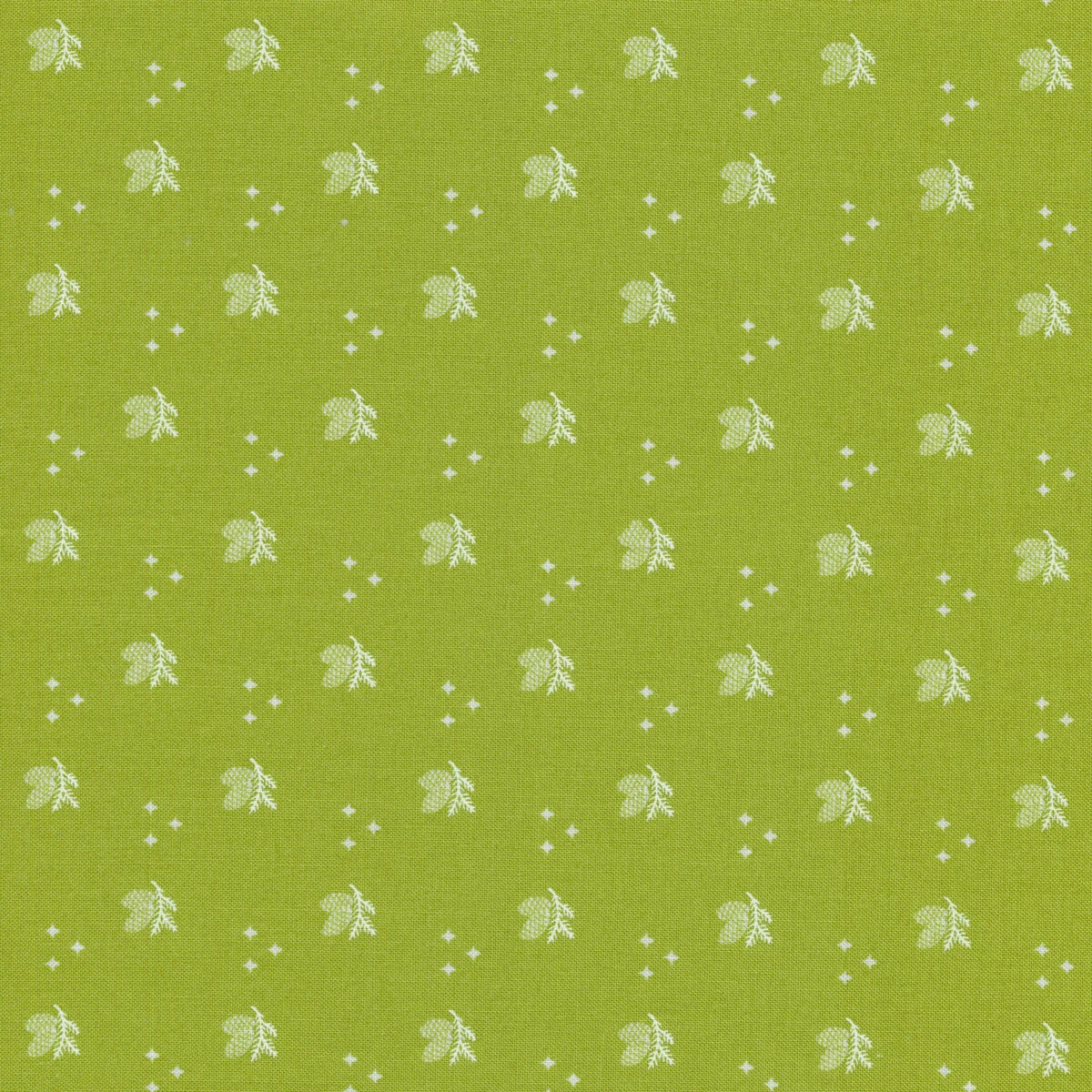 Christmas Stitched by Fig Tree & Co. from Moda Fabrics is a jolly collection featuring floral prints, damask, gingham, holly, pinecones, small homes, and The Night Before Christmas poem in classic Christmas colors. This fabric features a pinecone and star print on a green background.