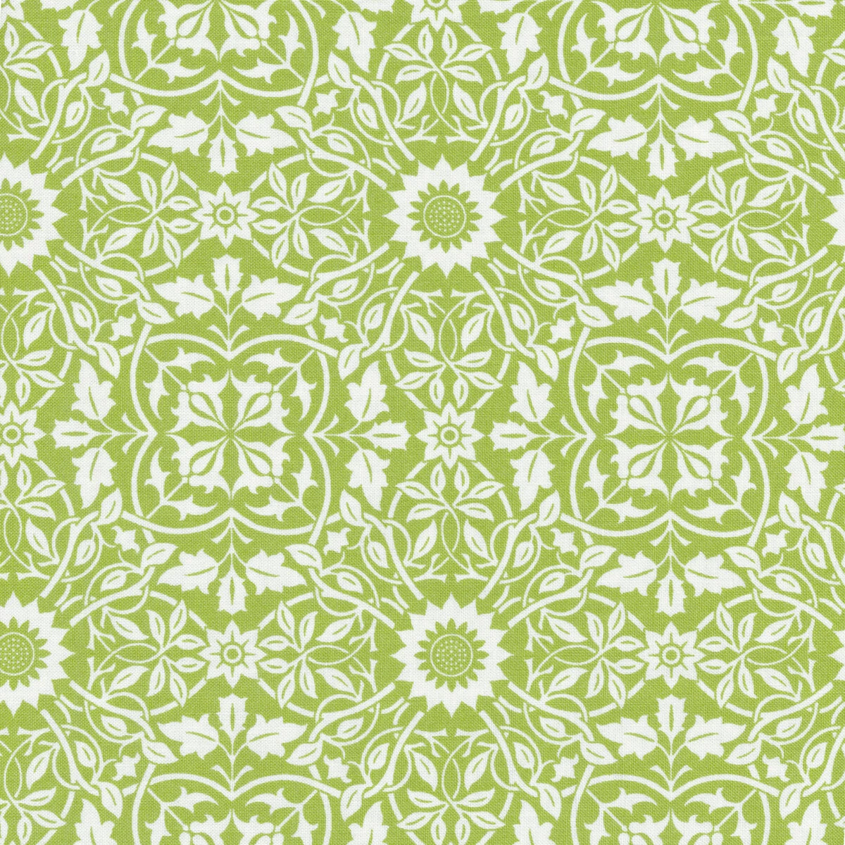 Christmas Stitched by Fig Tree & Co. from Moda Fabrics is a jolly collection featuring floral prints, damask, gingham, holly, pinecones, small homes, and The Night Before Christmas poem in classic Christmas colors. This fabric features a cream floral damask print on a green background.