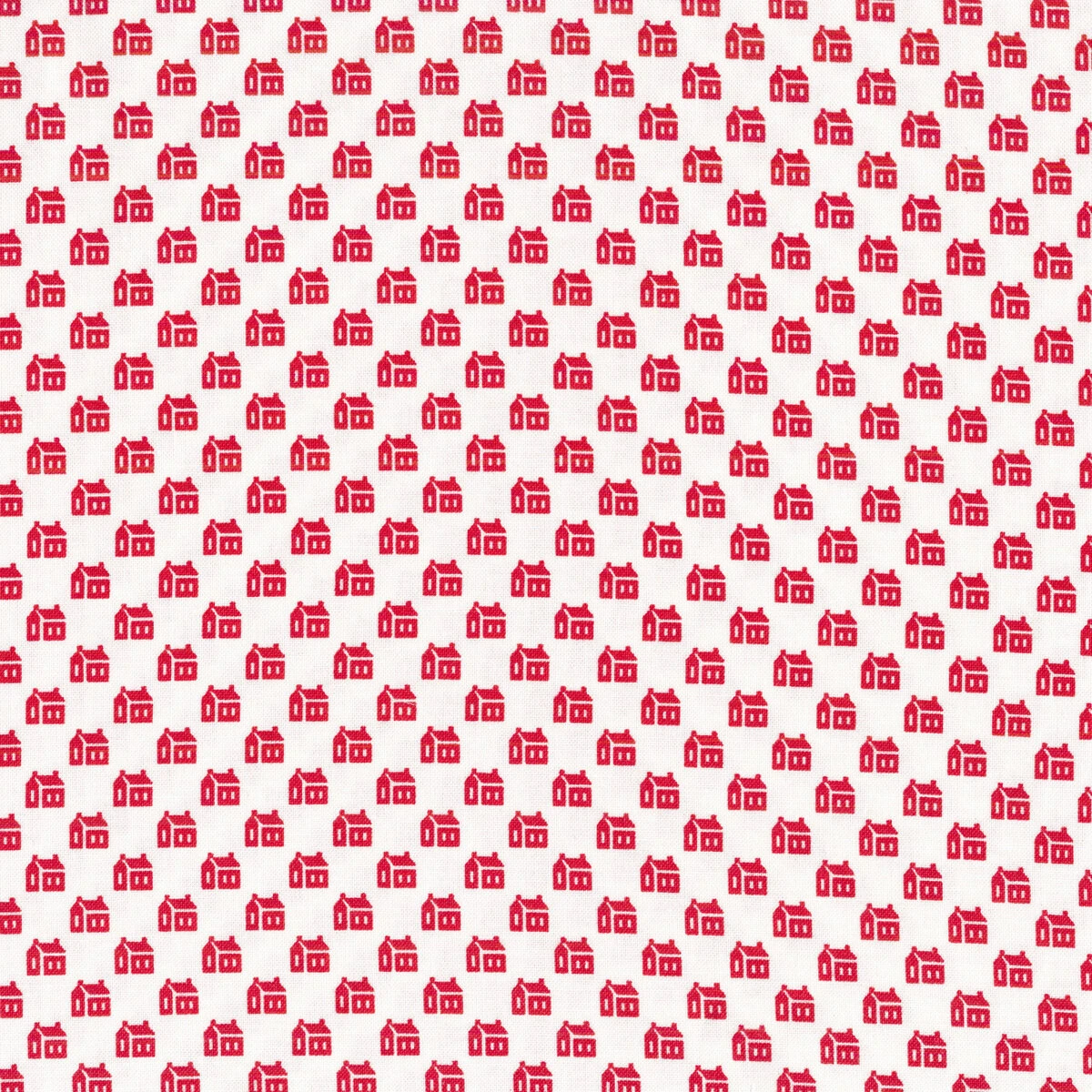Christmas Stitched by Fig Tree & Co. from Moda Fabrics is a jolly collection featuring floral prints, damask, gingham, holly, pinecones, small homes, and The Night Before Christmas poem in classic Christmas colors. This fabric features small red schoolhouses on a cream background.