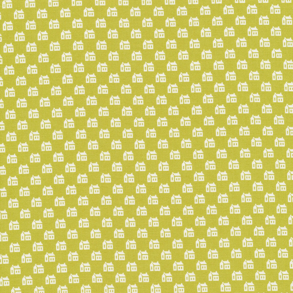 Christmas Stitched by Fig Tree & Co. from Moda Fabrics is a jolly collection featuring floral prints, damask, gingham, holly, pinecones, small homes, and The Night Before Christmas poem in classic Christmas colors. This fabric features small cream schoolhouses on a green background.