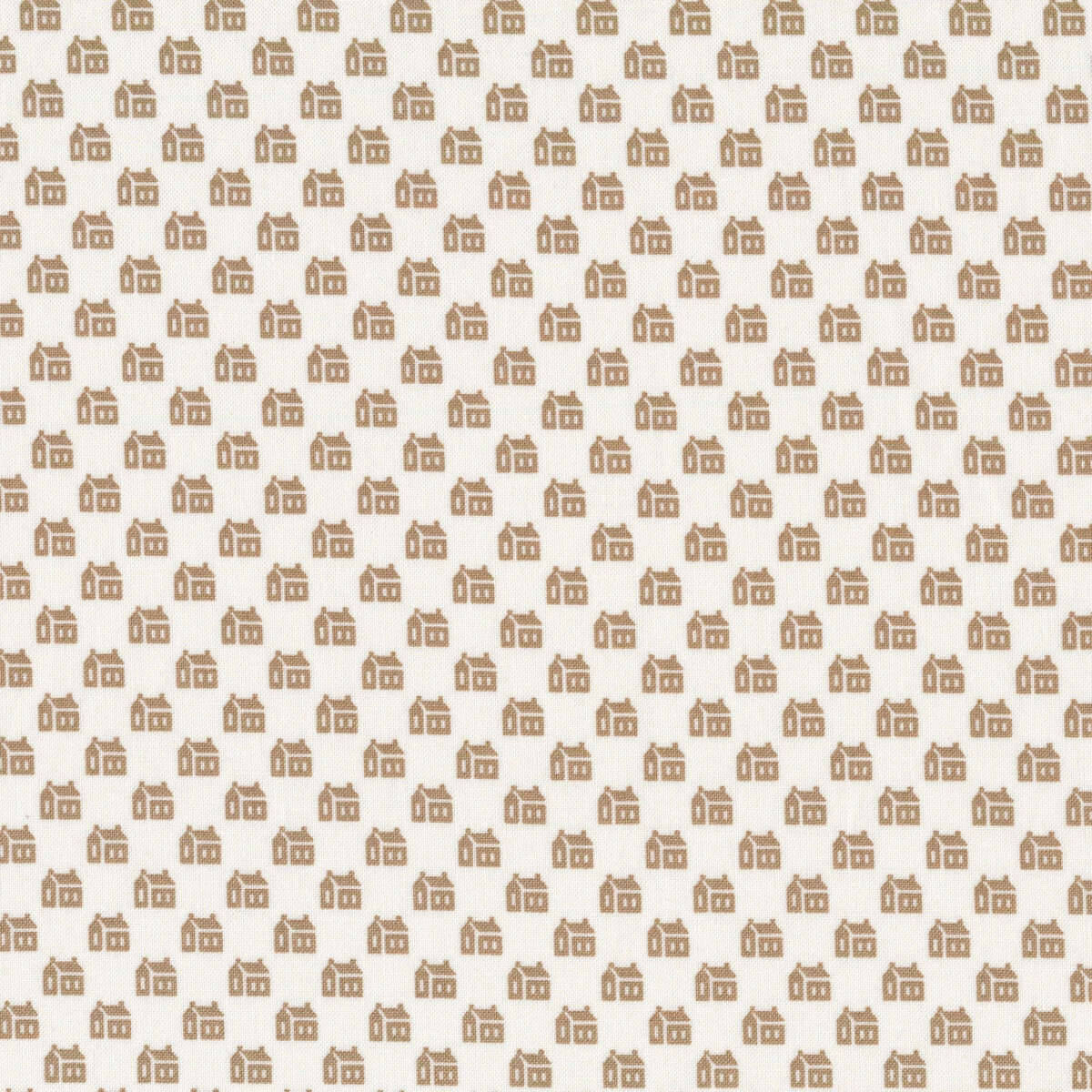 Christmas Stitched by Fig Tree & Co. from Moda Fabrics is a jolly collection featuring floral prints, damask, gingham, holly, pinecones, small homes, and The Night Before Christmas poem in classic Christmas colors. This fabric features small brown schoolhouses on a cream background.