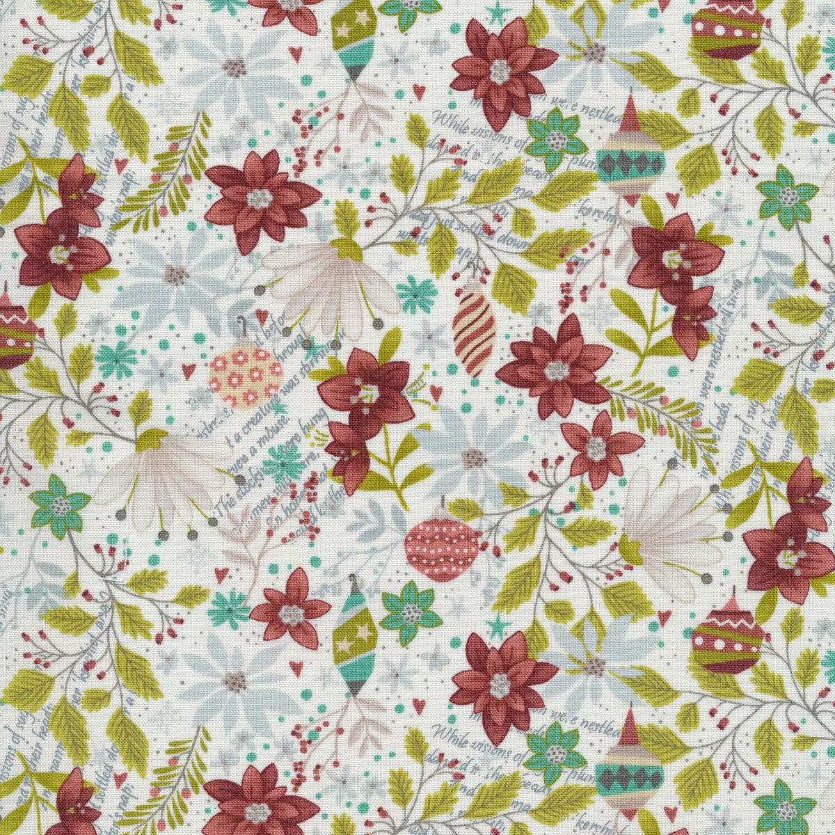 Countdown to Christmas by Janet Rae Nesbitt for Henry Glass Fabrics is an adorable Christmas collection featuring Christmas ornaments, pine trees, stripes, polka dots, holiday words and number prints all with fun, stylistic looks. This fabric features lovely florals, leaves, and ornaments on a cream background.