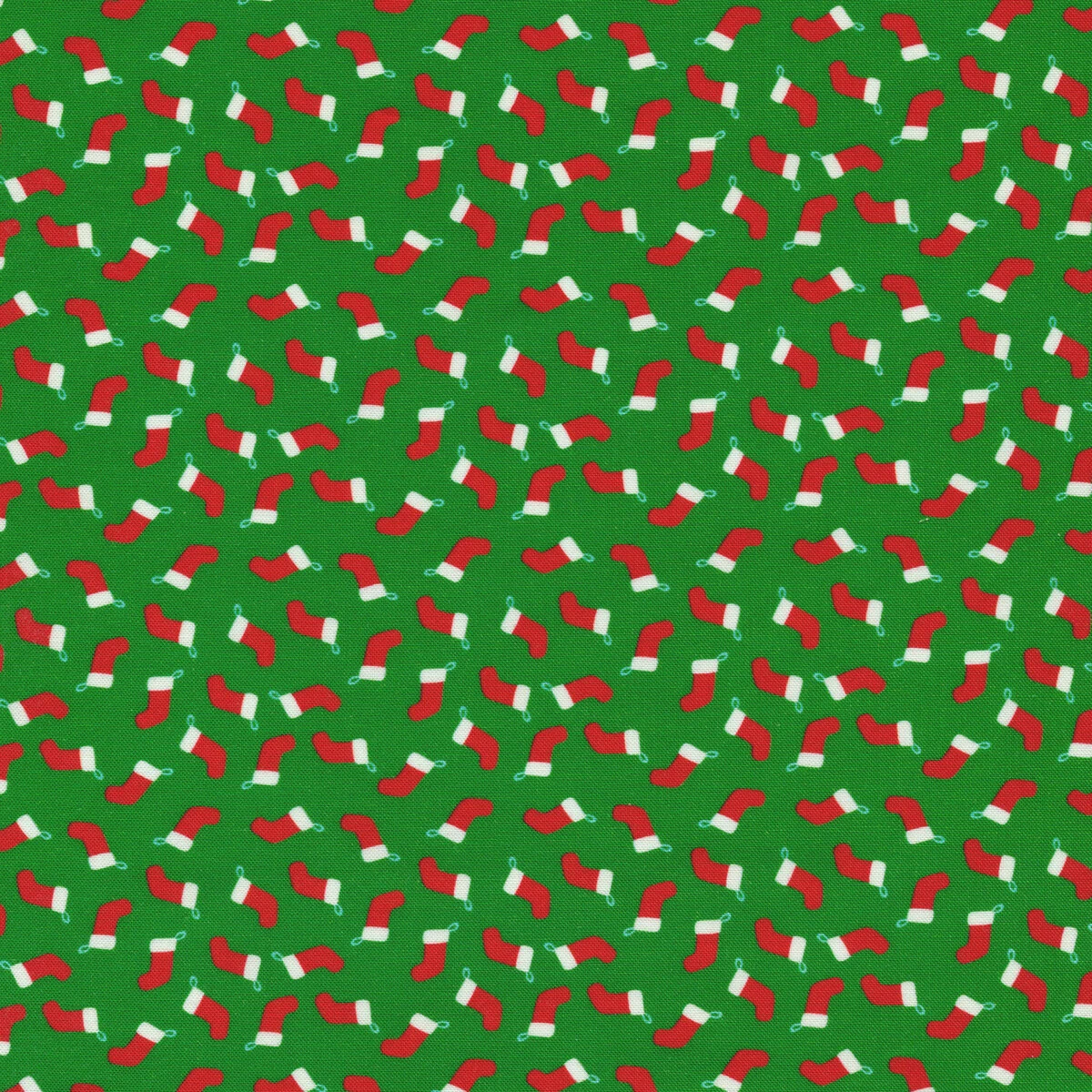 This Holiday Essentials – Christmas Collection designed by Stacy Iest Hsu for Moda features classic red and green colors with sweet ditsy print motifs of Santas, ornaments, holly leaves, candy canes and more! Make your next stocking stuffer gift with this green fabric featuring red Christmas stockings in a ditsy print!