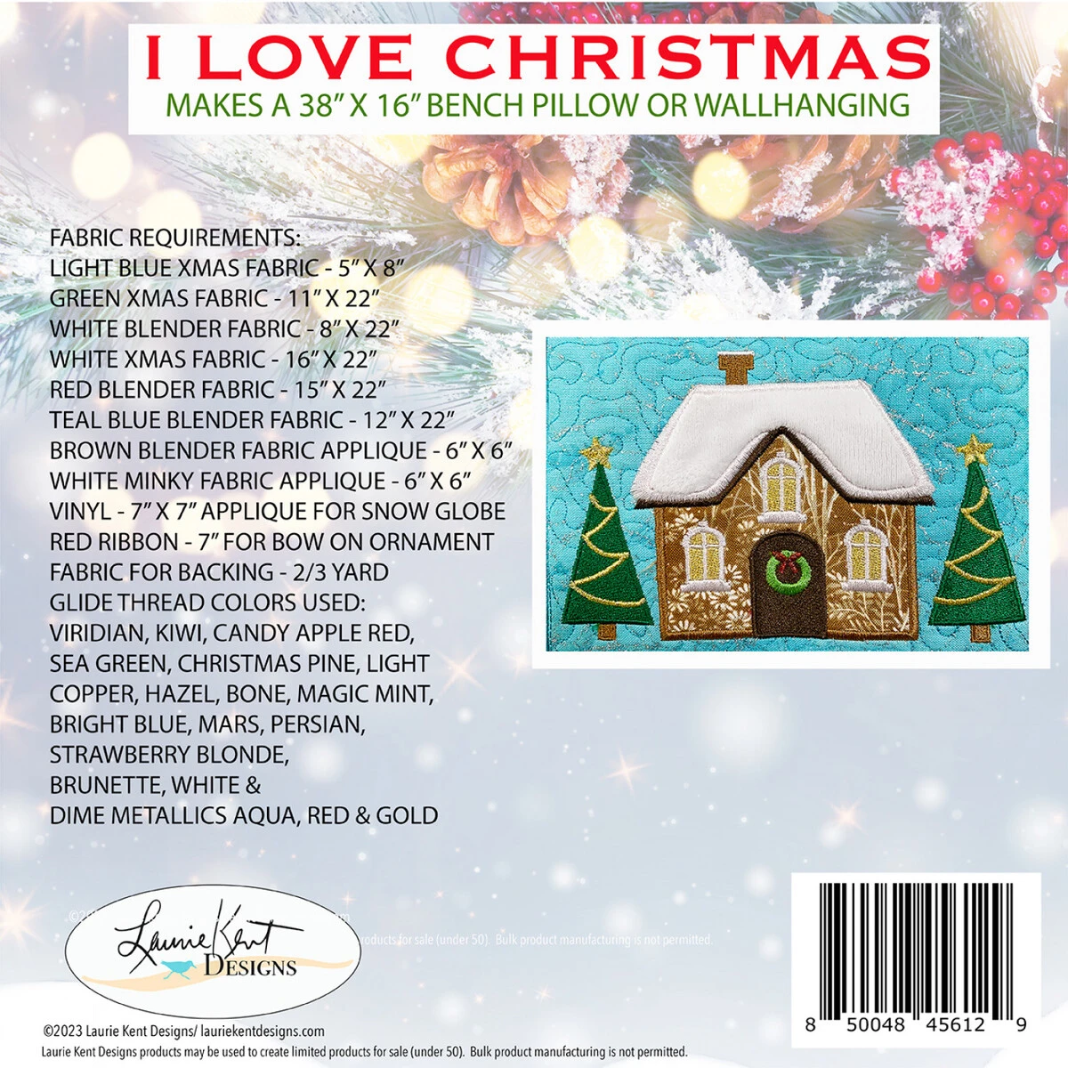 From Laurie Kent Designs comes I Love Christmas, an adorable and festive machine embroidery USB, perfect for the holiday season. Featuring more than 16 blocks of machine embroidery designs including classic Christmas motifs such as a snowman, reindeer, nutcracker, lights, ornaments, and Santa with presents, the project ideas are endless. Directions and diagrams are also included for perfect placement. The designs work great for a 38″ x 16″ bench pillow or wall hanging project.