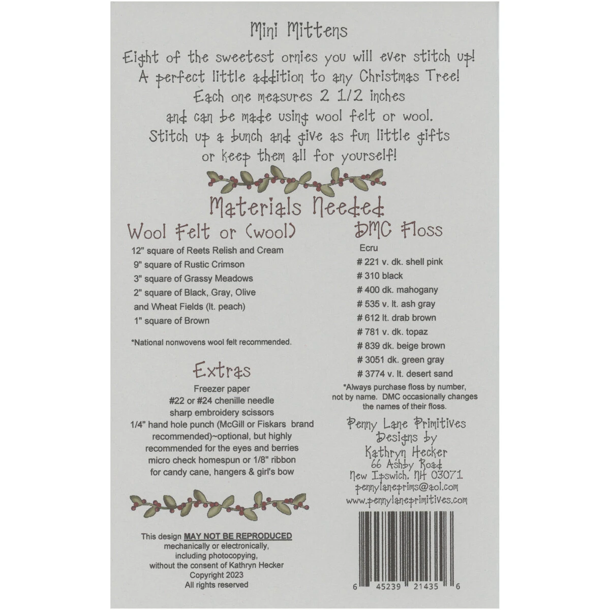 From Penny Lane Primitives comes the adorable Mini Mitten Christmas Ornaments Pattern! Using clear instructions, illustrations, and templates for each unique mitten, this pattern will help you craft eight woolen and primitively stitched applique mini mitten ornaments for your or a dear one’s Christmas tree. Each mitten measures 2-1/2″.