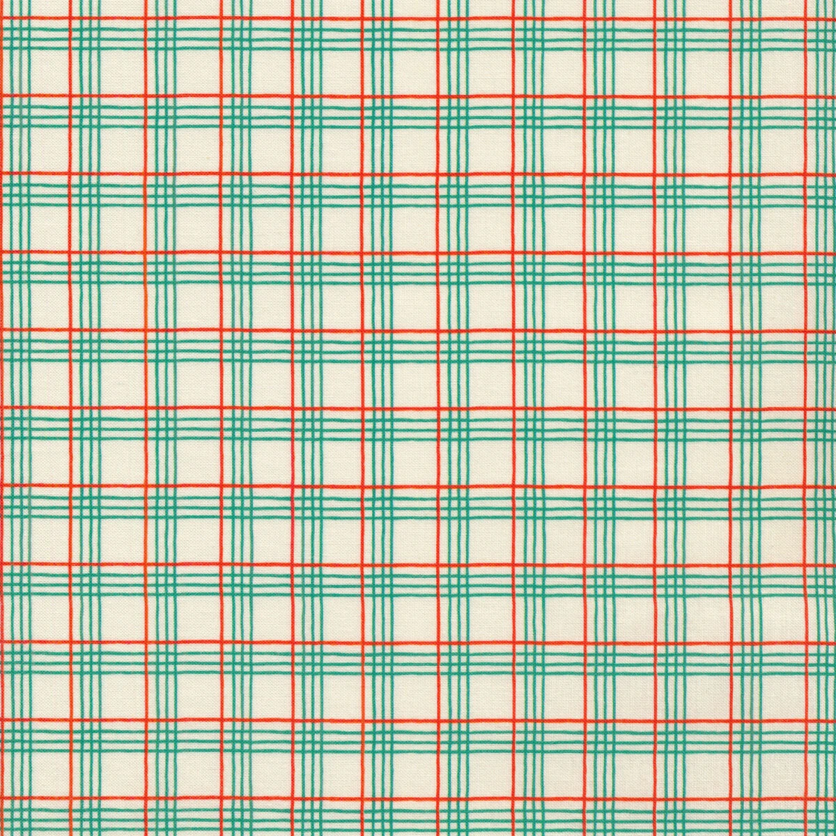 Oh What Fun by Poppie Cotton is an adorable Christmas collection full of bright colors, Santa, reindeers, florals, plaids, and more! This fabric features teal and red plaid stripes on a cream background.Â