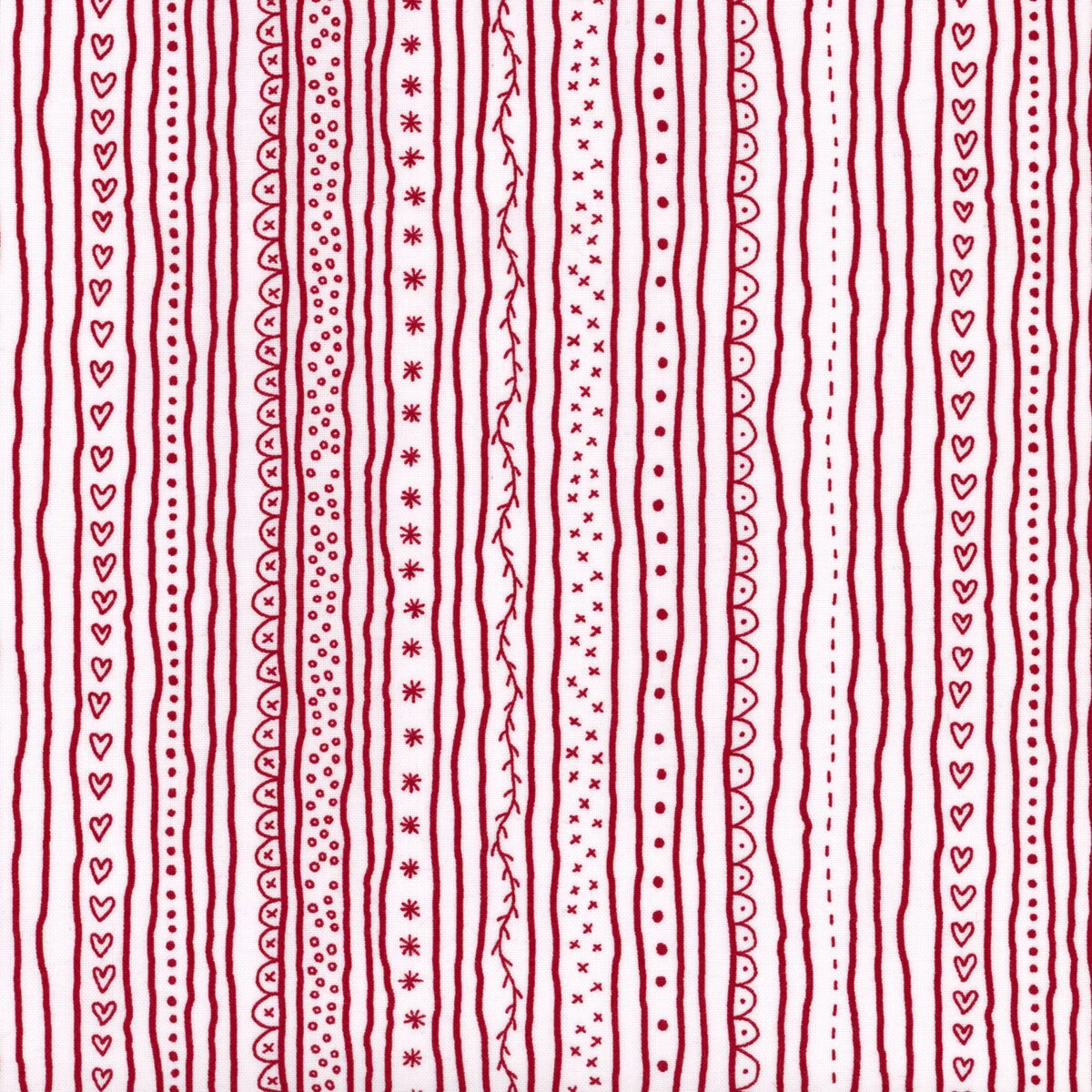 Redwork Christmas from Henry Glass is a charming nostalgic collection featuring traditional redwork designs with Christmas motifs like holly, presents, and stockings with more versatile patterns to accent your next holiday quilt! This fabric features abstract red stripes with polka dots, hearts and pindots on a white background.Â