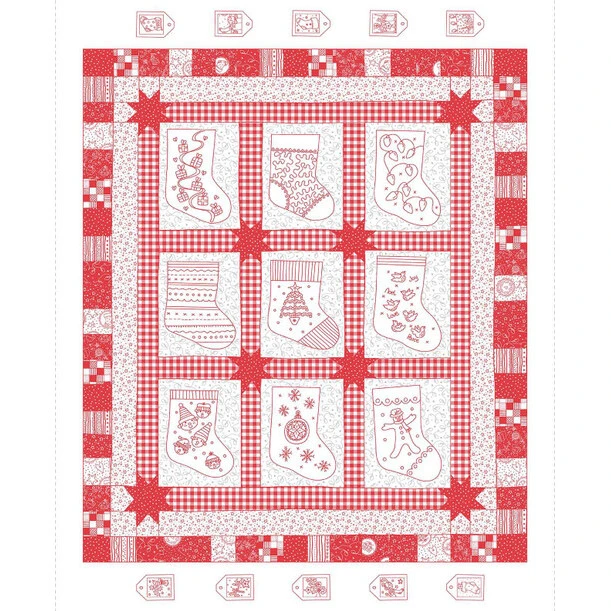 Redwork Christmas from Henry Glass is a charming nostalgic collection featuring traditional redwork designs with Christmas motifs like holly, presents, and stockings with more versatile patterns to accent your next holiday quilt! This panel features 3″ x 3″ squares with stockings and borders. Panel size is approximately 36″ x 44″.