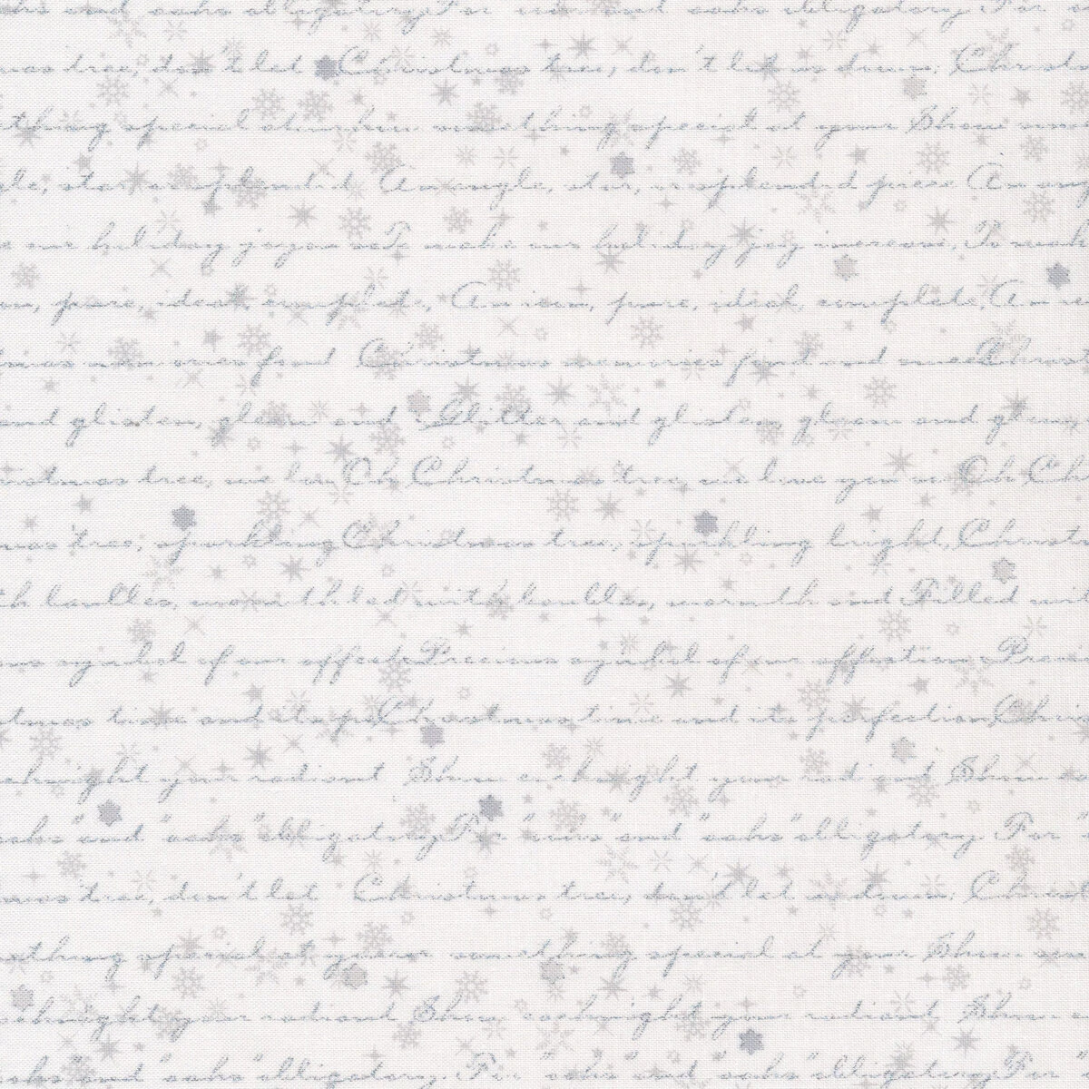 Frosty Snowflake by Stof Fabrics is another beautiful Christmas fabric collection full of gold and silver metallic accents. You’ll find snowflakes, swirls, scrolls, stars, and more! This fabric features columns of silver metallic cursive writing and small stars on a solid white background.
