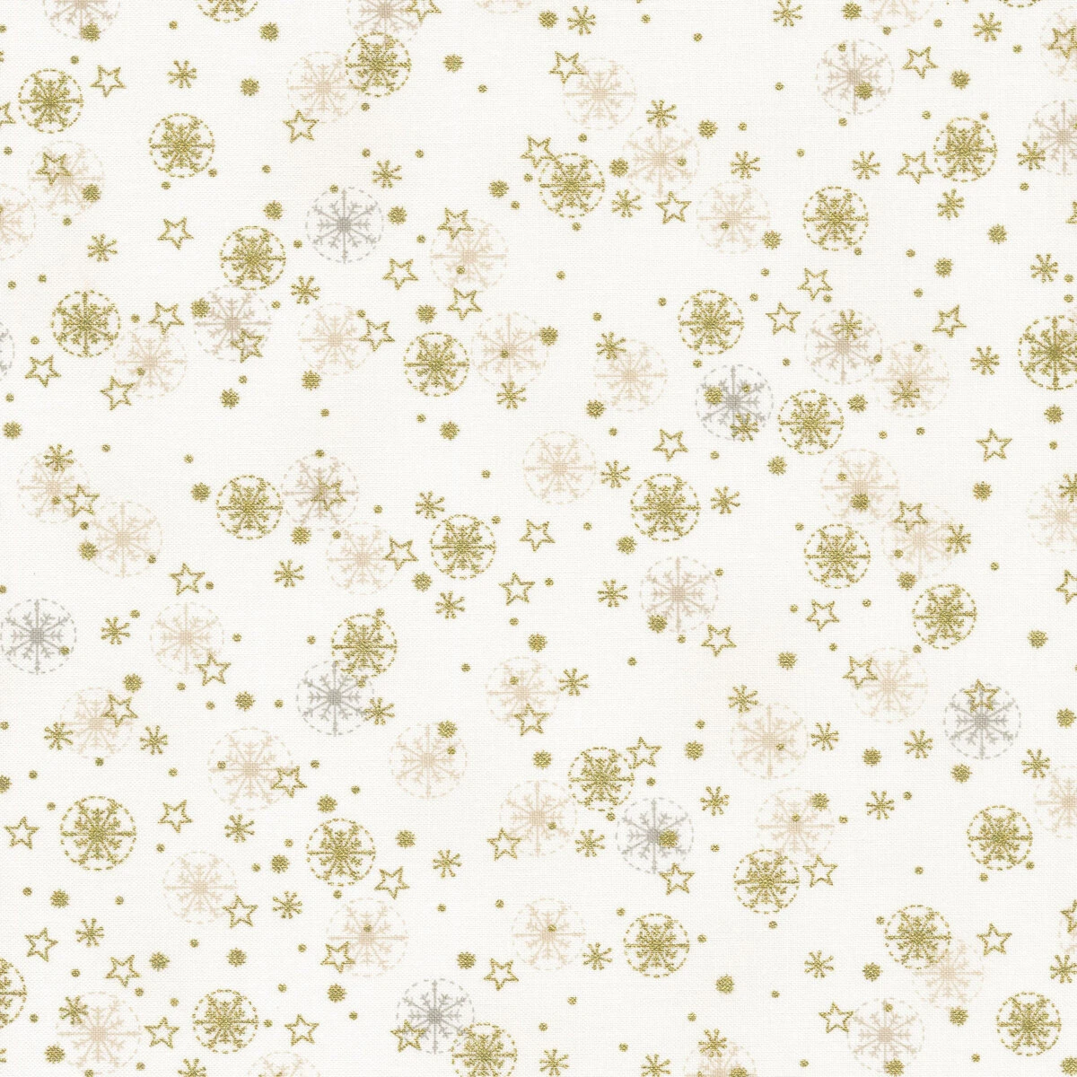 Frosty Snowflake by Stof Fabrics is another beautiful Christmas fabric collection full of gold and silver metallic accents. You’ll find snowflakes, swirls, scrolls, stars, and more! This fabric features gold metallic snowflakes and stars on a light cream background.