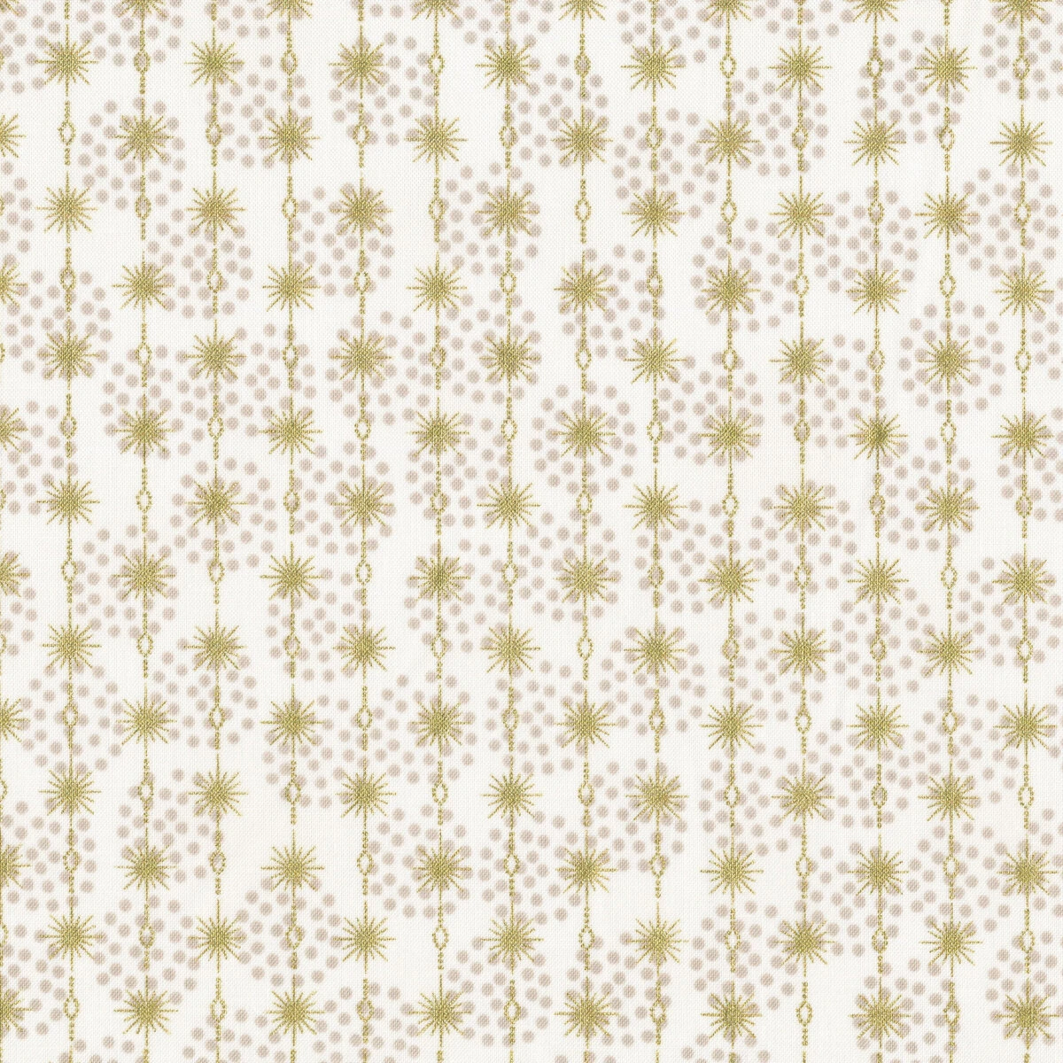 Frosty Snowflake by Stof Fabrics is another beautiful Christmas fabric collection full of gold and silver metallic accents. You’ll find snowflakes, swirls, scrolls, stars, and more! This fabric features gold metallic chained stars forming stripes on a cream background.