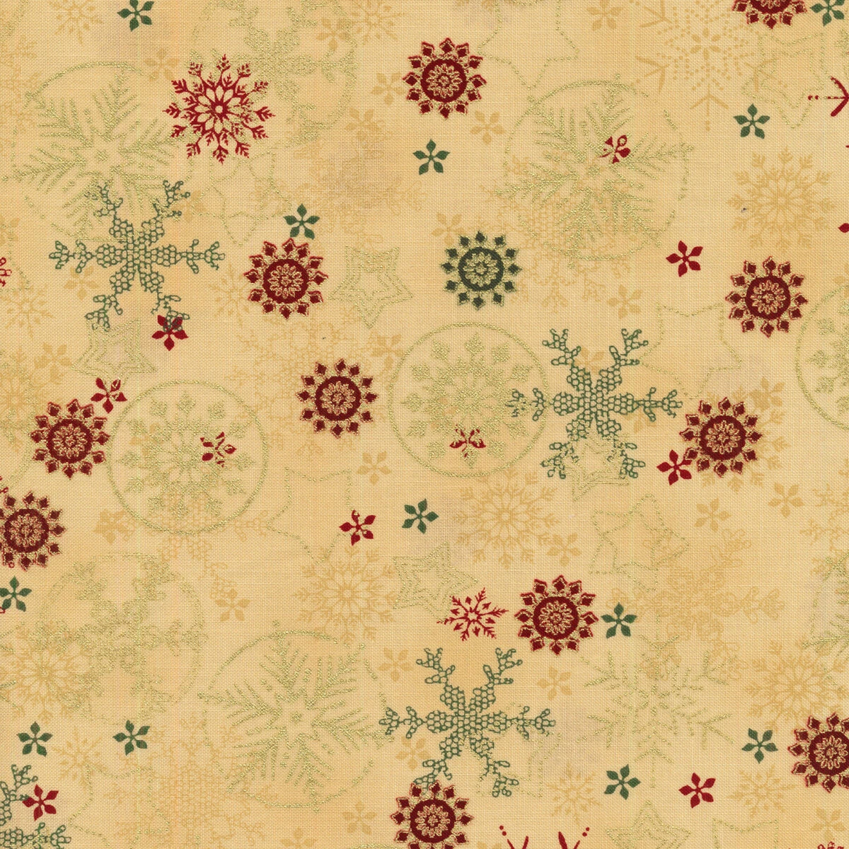 Frosty Snowflake by Stof Fabrics is another beautiful Christmas fabric collection full of gold and silver metallic accents. You’ll find snowflakes, swirls, scrolls, stars, and more! This fabric features green and red snowflakes with gold metallic star accents all over a beige background.