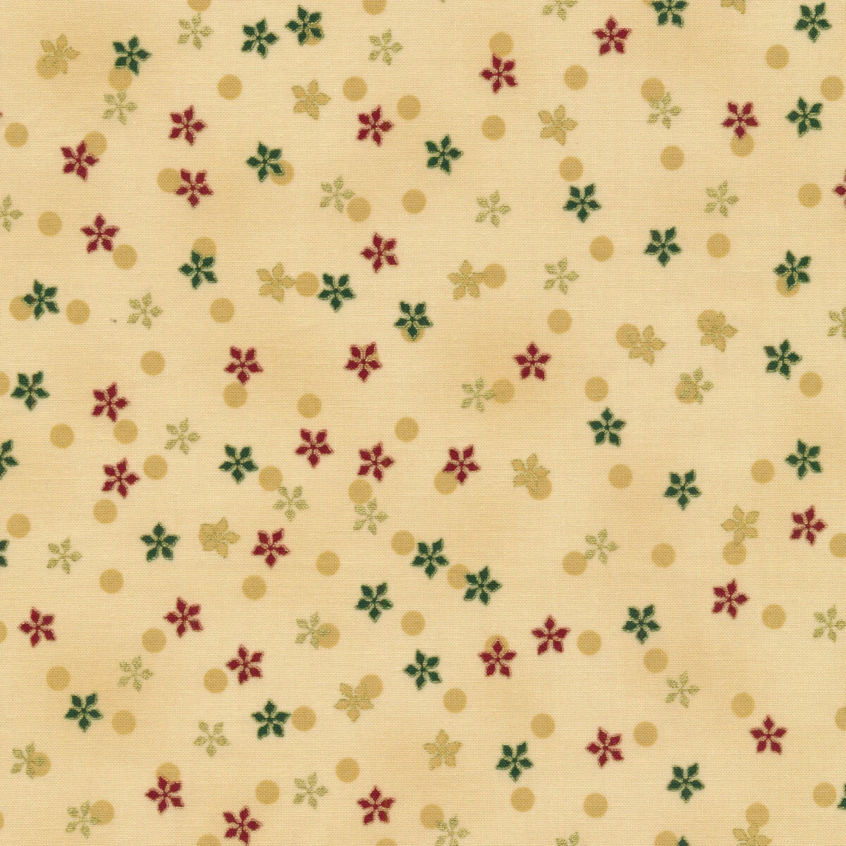Frosty Snowflake by Stof Fabrics is another beautiful Christmas fabric collection full of gold and silver metallic accents. You’ll find snowflakes, swirls, scrolls, stars, and more! This fabric features light tan polka dots and red, green, and gold metallic poinsettia flowers on a light beige background.