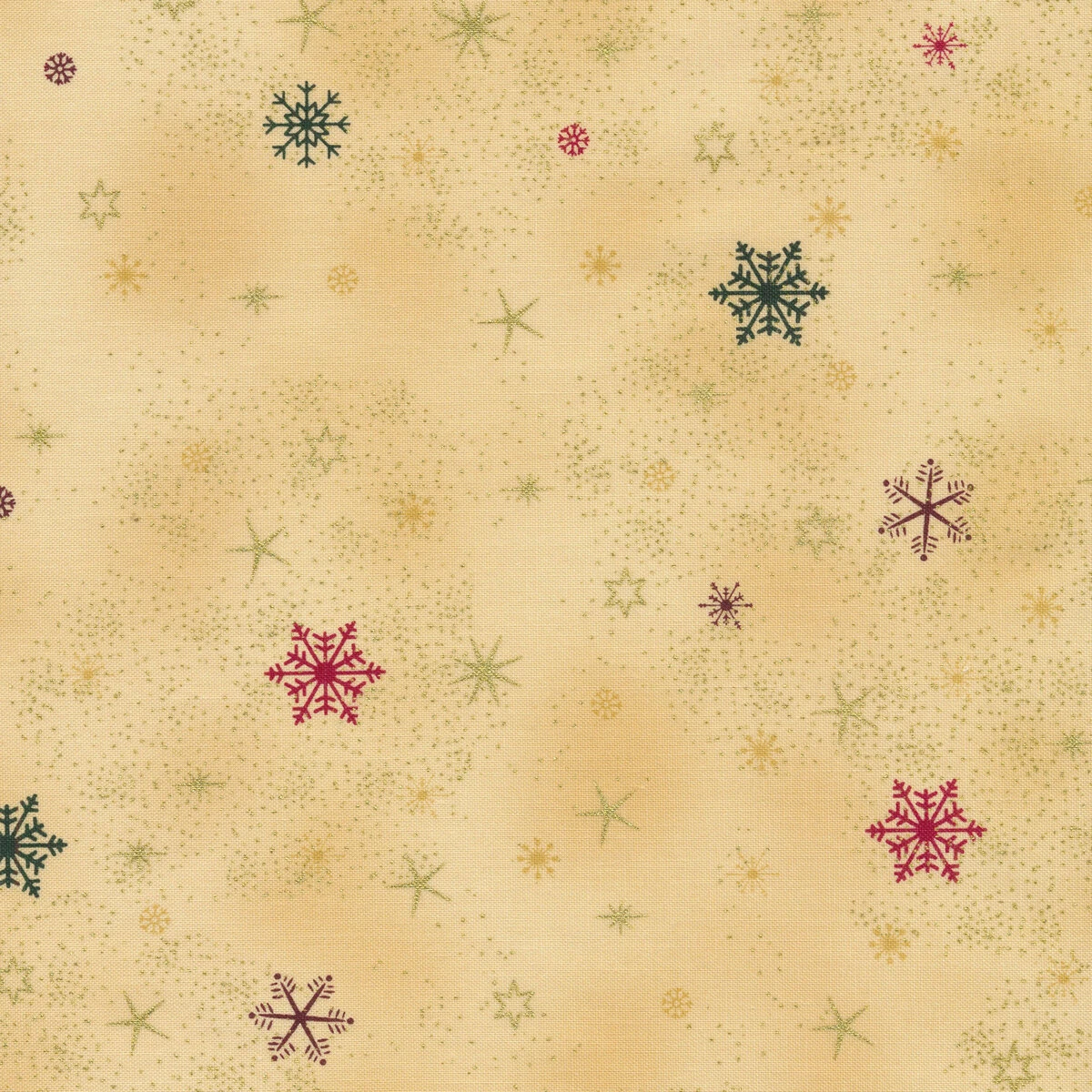 Frosty Snowflake by Stof Fabrics is another beautiful Christmas fabric collection full of gold and silver metallic accents. You’ll find snowflakes, swirls, scrolls, stars, and more! This fabric features green, red, and gold snowflakes with gold metallic speckled dots in clusters on a light beige background.
