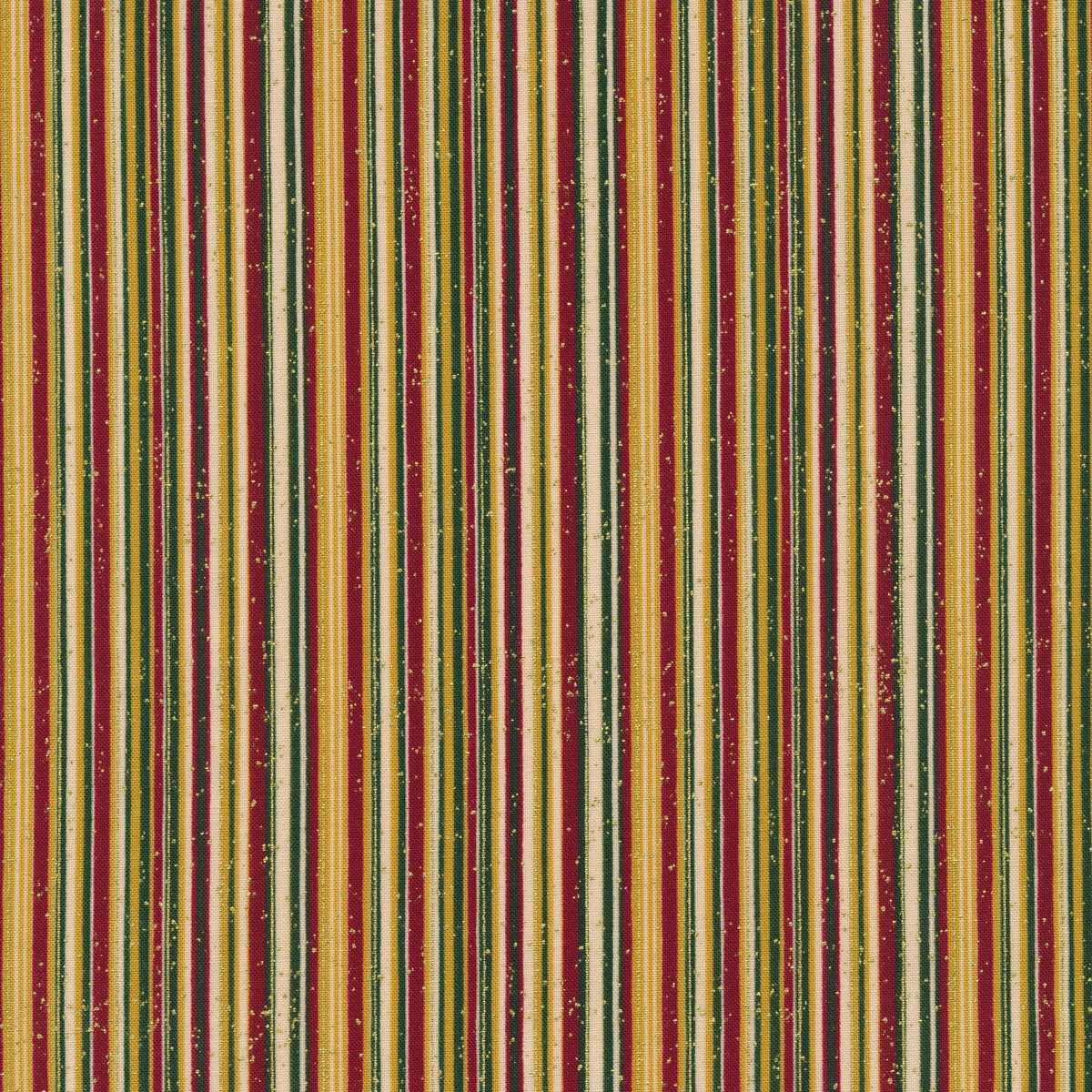 Frosty Snowflake by Stof Fabrics is another beautiful Christmas fabric collection full of gold and silver metallic accents. You’ll find snowflakes, swirls, scrolls, stars, and more! This fabric features green, red, and gold metallic stripes on a light beige background.