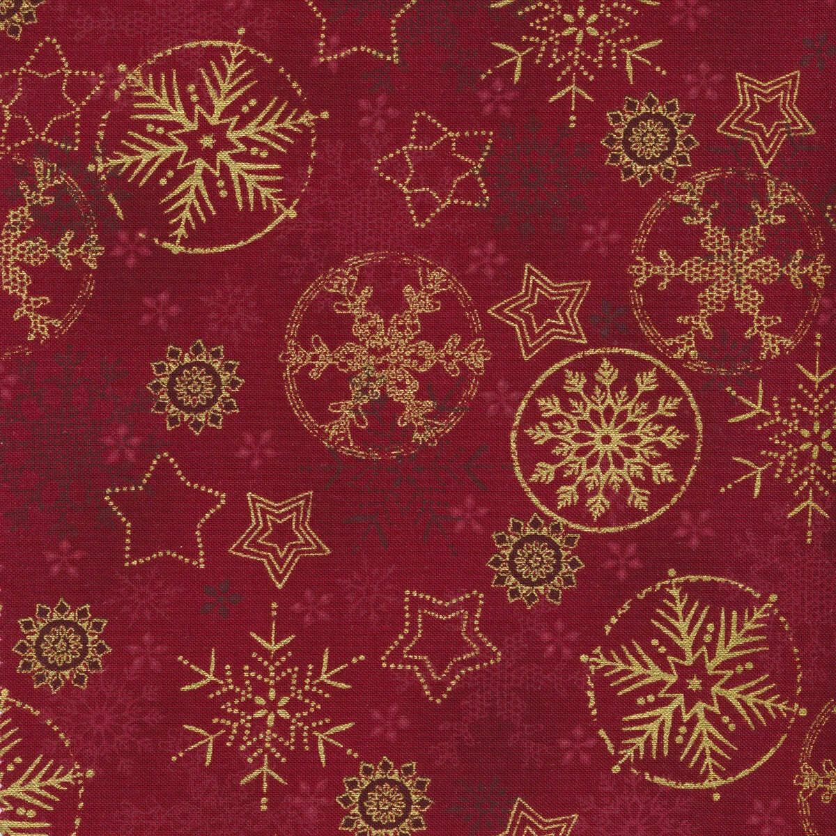 Frosty Snowflake by Stof Fabrics is another beautiful Christmas fabric collection full of gold and silver metallic accents. You’ll find snowflakes, swirls, scrolls, stars, and more! This fabric features gold metallic snowflakes and stars on a bright red background.