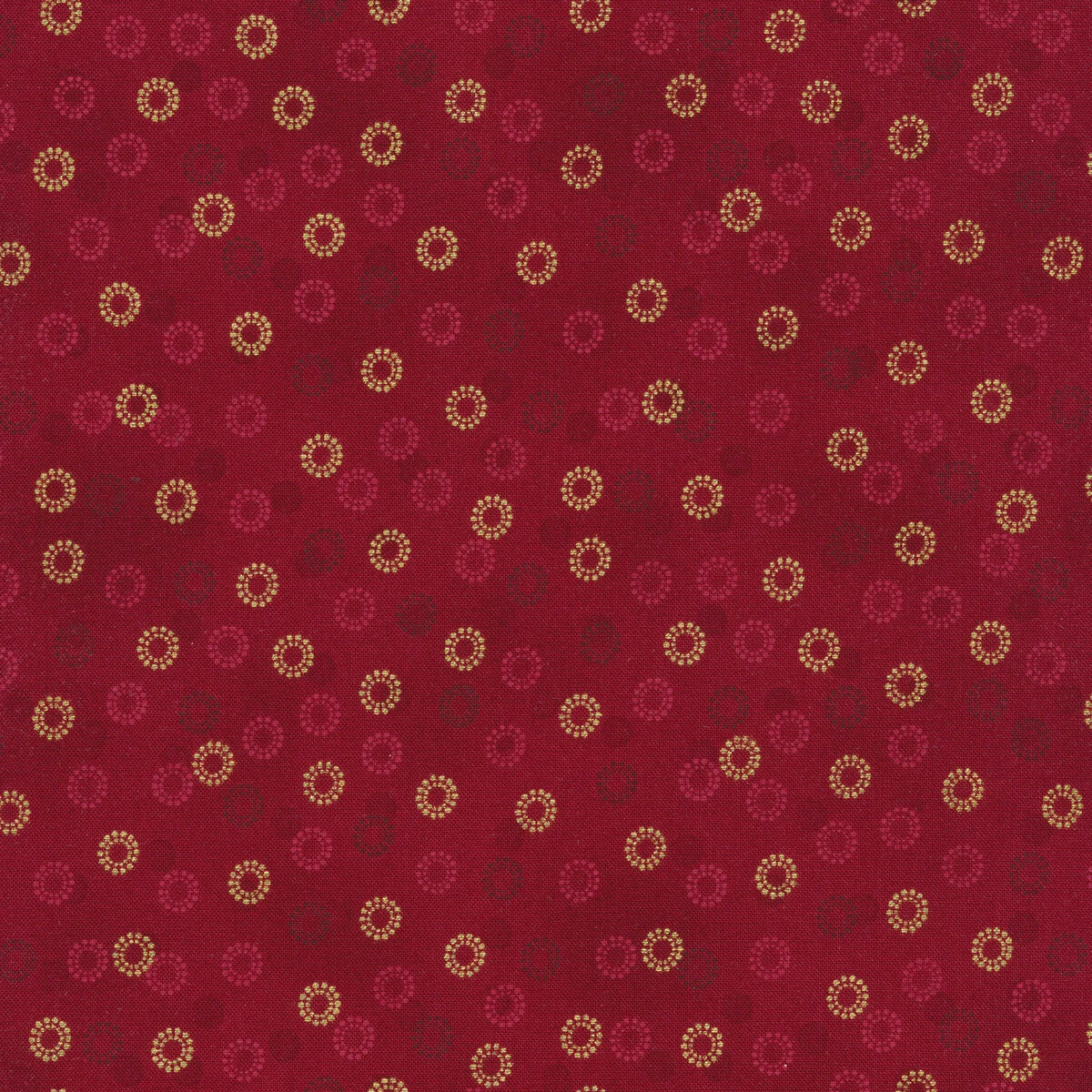Frosty Snowflake by Stof Fabrics is another beautiful Christmas fabric collection full of gold and silver metallic accents. You’ll find snowflakes, swirls, scrolls, stars, and more! This fabric features gold metallic shining stars connected by chains against a mottled red background.