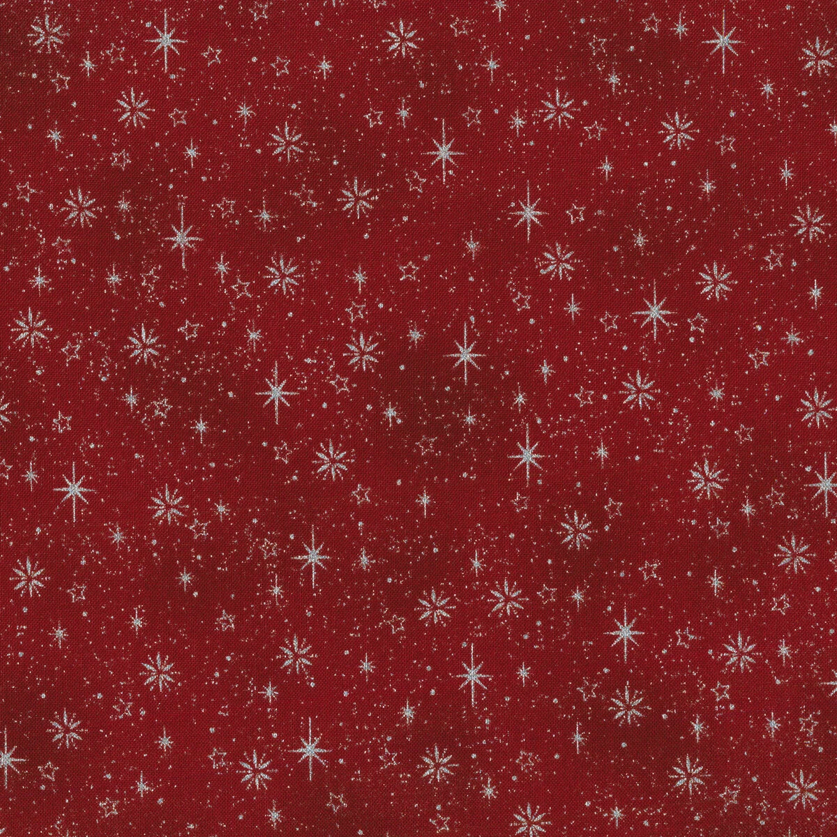 Frosty Snowflake by Stof Fabrics is another beautiful Christmas fabric collection full of gold and silver metallic accents. You’ll find snowflakes, swirls, scrolls, stars, and more! This fabric features silver metallic twinkling stars and snowflakes all over a mottled red background.