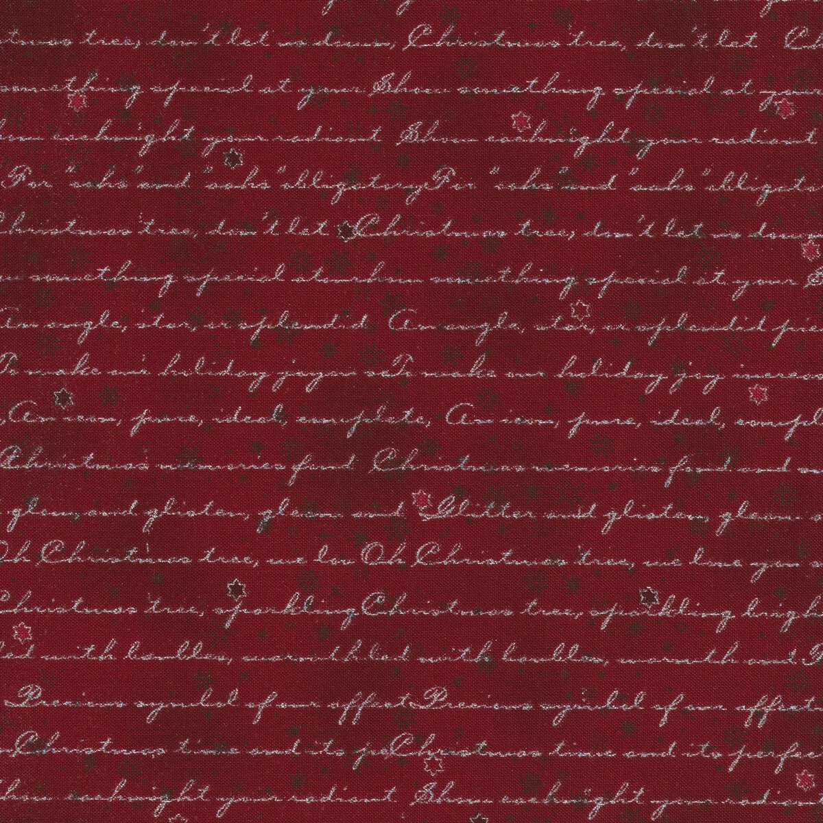 Frosty Snowflake by Stof Fabrics is another beautiful Christmas fabric collection full of gold and silver metallic accents. You’ll find snowflakes, swirls, scrolls, stars, and more! This fabric features silver metallic cursive writing and small stars all over a mottled red background.