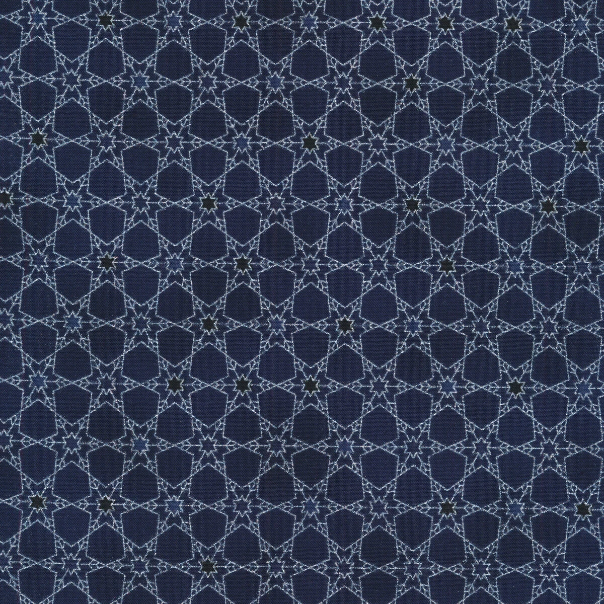 Frosty Snowflake by Stof Fabrics is another beautiful Christmas fabric collection full of gold and silver metallic accents. You’ll find snowflakes, swirls, scrolls, stars, and more! This fabric features silver metallic touching stars forming a geometric pattern over a mottled navy blue background.