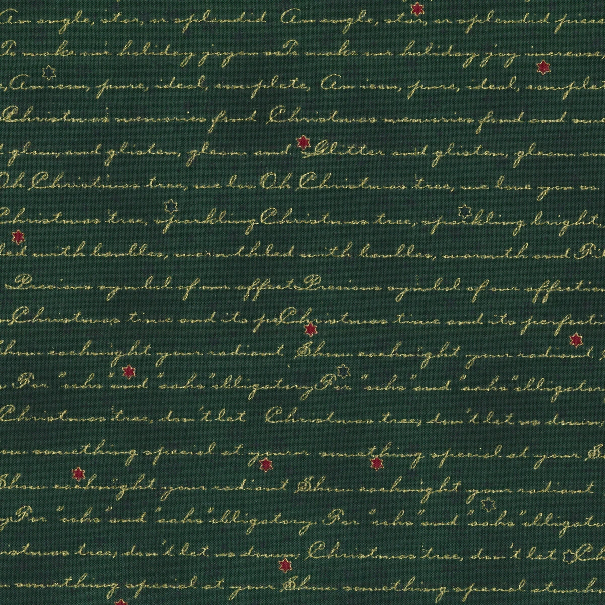 Frosty Snowflake by Stof Fabrics is another beautiful Christmas fabric collection full of gold and silver metallic accents. You’ll find snowflakes, swirls, scrolls, stars, and more! This fabric features gold metallic cursive writing and small stars all over a mottled forest green background.