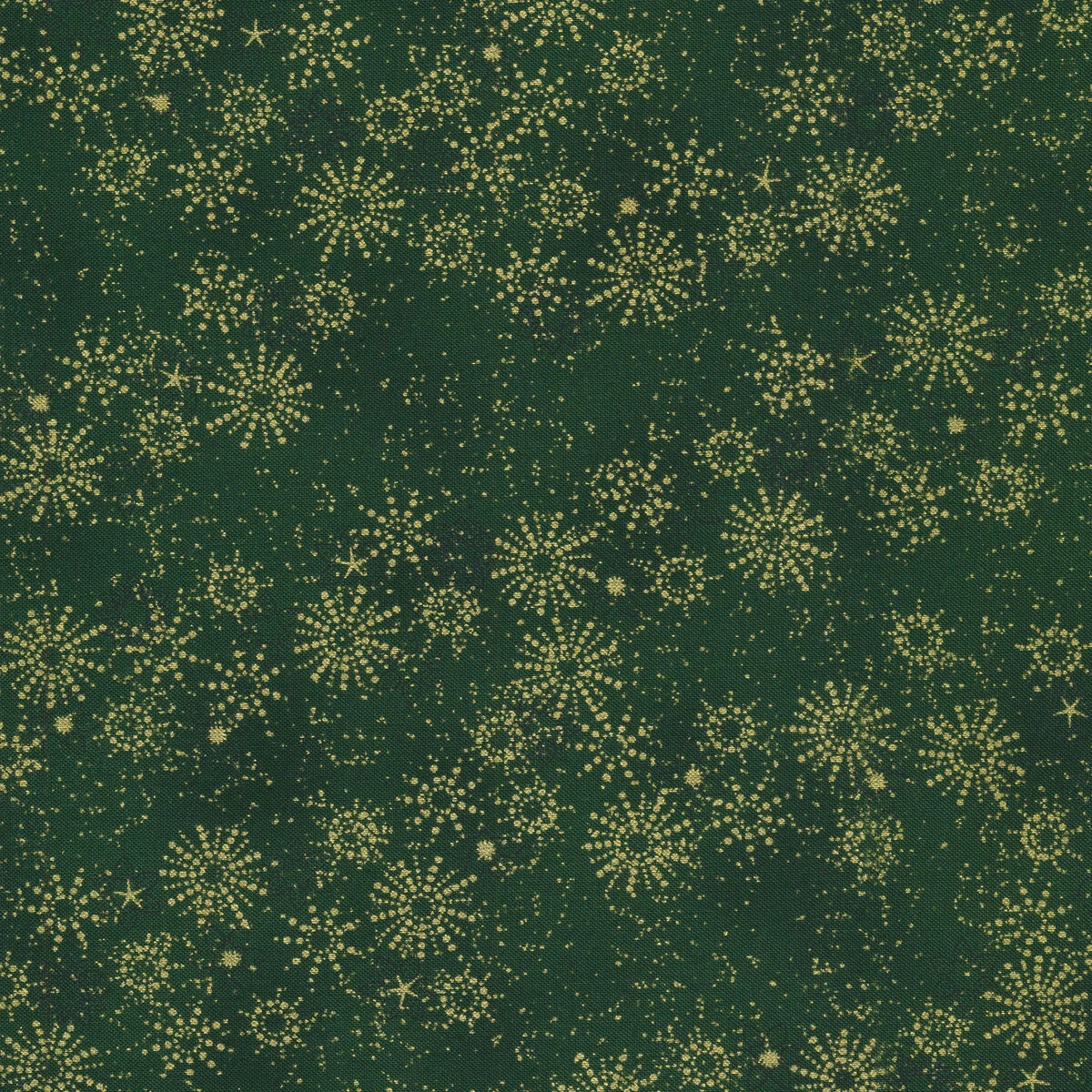 Frosty Snowflake by Stof Fabrics is another beautiful Christmas fabric collection full of gold and silver metallic accents. You’ll find snowflakes, swirls, scrolls, stars, and more! This fabric features dark green and gold metallic speckles and snowflakes all over.