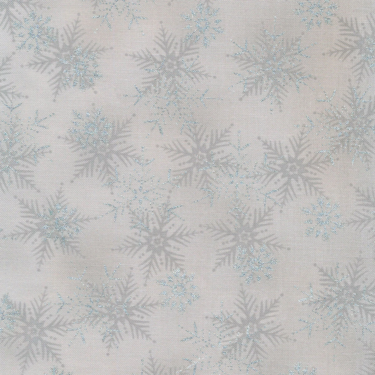 Frosty Snowflake by Stof Fabrics is another beautiful Christmas fabric collection full of gold and silver metallic accents. You’ll find snowflakes, swirls, scrolls, stars, and more! This fabric features light gray and silver metallic snowflakes all over a mottled gray background.