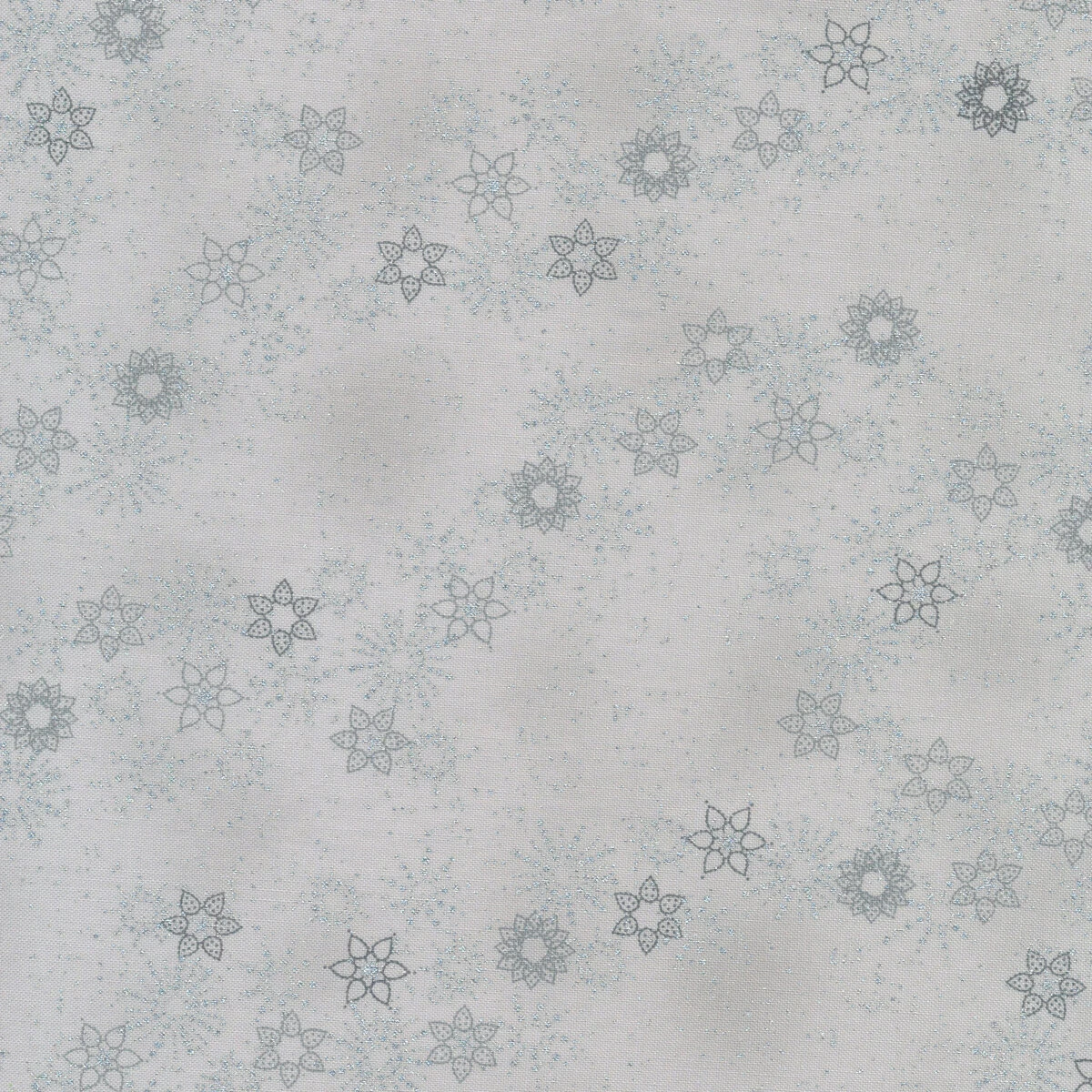 Frosty Snowflake by Stof Fabrics is another beautiful Christmas fabric collection full of gold and silver metallic accents. You’ll find snowflakes, swirls, scrolls, stars, and more! This fabric features dark and light gray snowflakes with silver metallic accents and speckles all over.