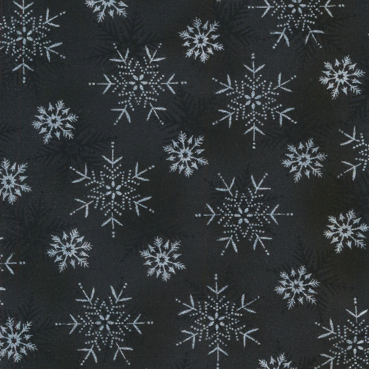 Frosty Snowflake by Stof Fabrics is another beautiful Christmas fabric collection full of gold and silver metallic accents. You’ll find snowflakes, swirls, scrolls, stars, and more! This fabric features black and silver metallic snowflakes all over a black and charcoal mottled background.