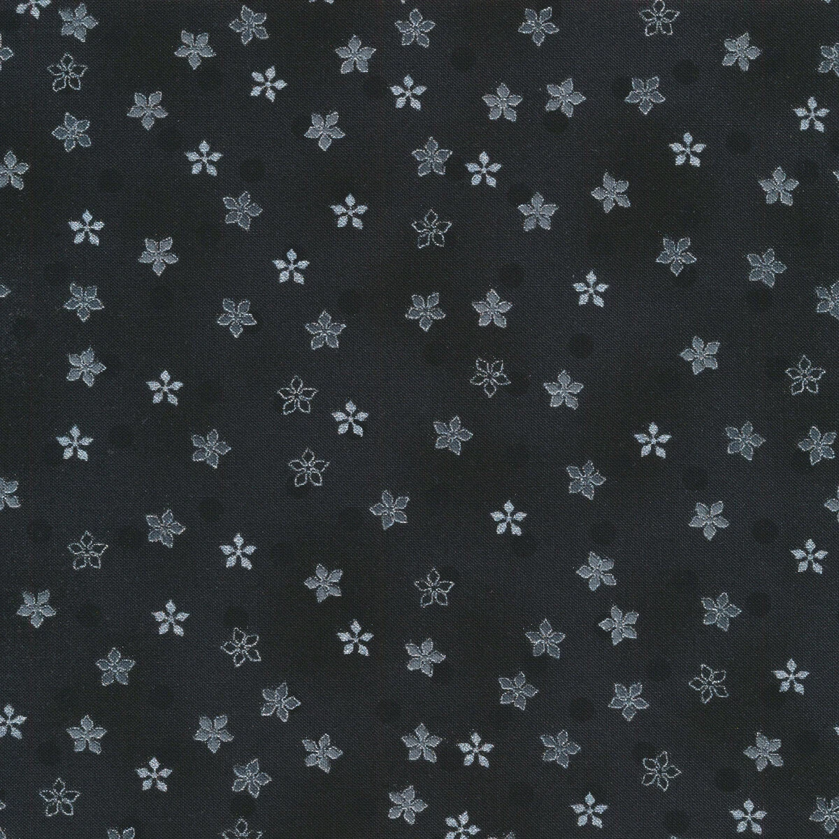 Frosty Snowflake by Stof Fabrics is another beautiful Christmas fabric collection full of gold and silver metallic accents. You’ll find snowflakes, swirls, scrolls, stars, and more! This fabric black polka dots and silver metallic poinsettia flower accents all over a black and charcoal mottled fabric.