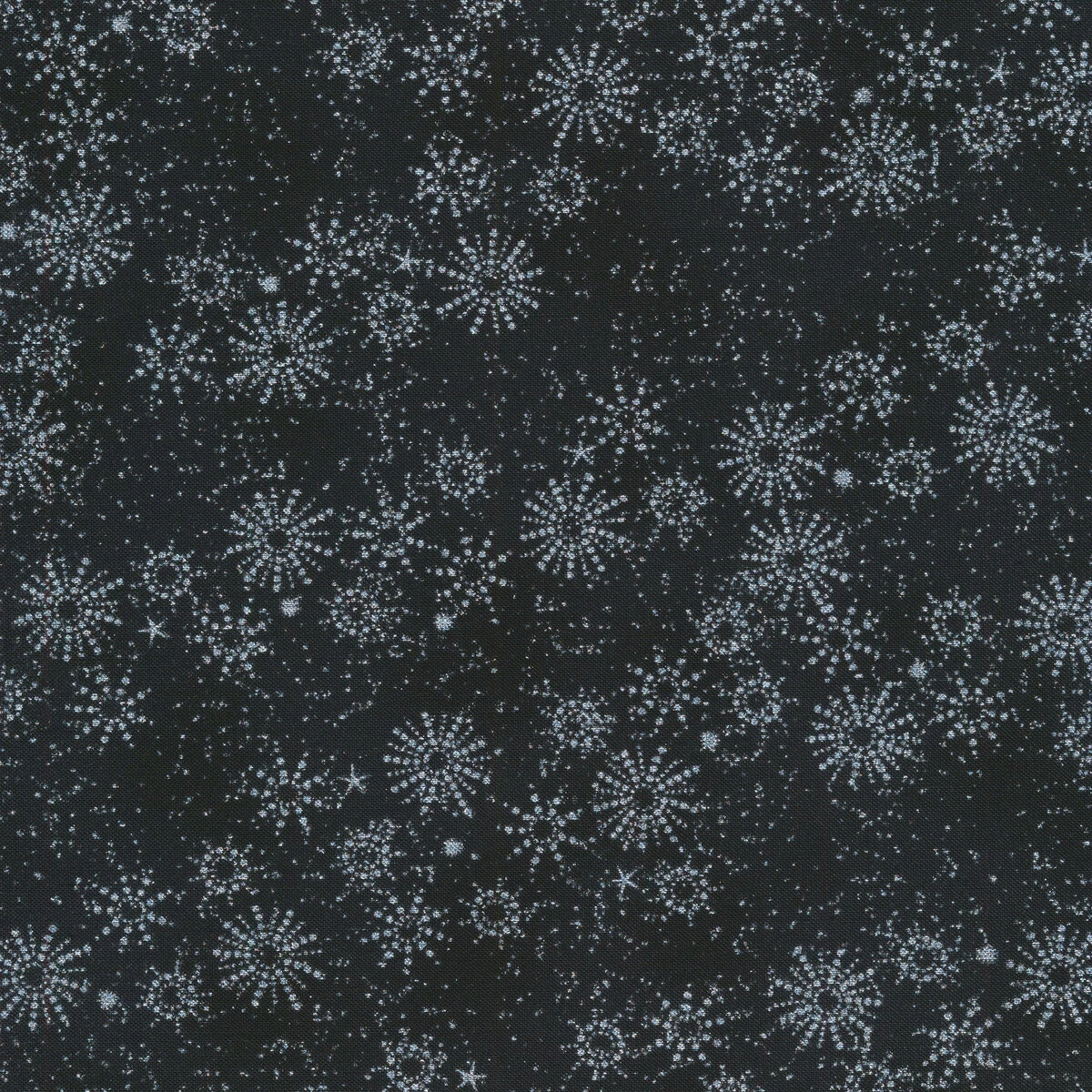 Frosty Snowflake by Stof Fabrics is another beautiful Christmas fabric collection full of gold and silver metallic accents. You’ll find snowflakes, swirls, scrolls, stars, and more! This fabric features silver metallic snowflakes and speckled dots all over a black and charcoal mottled background.