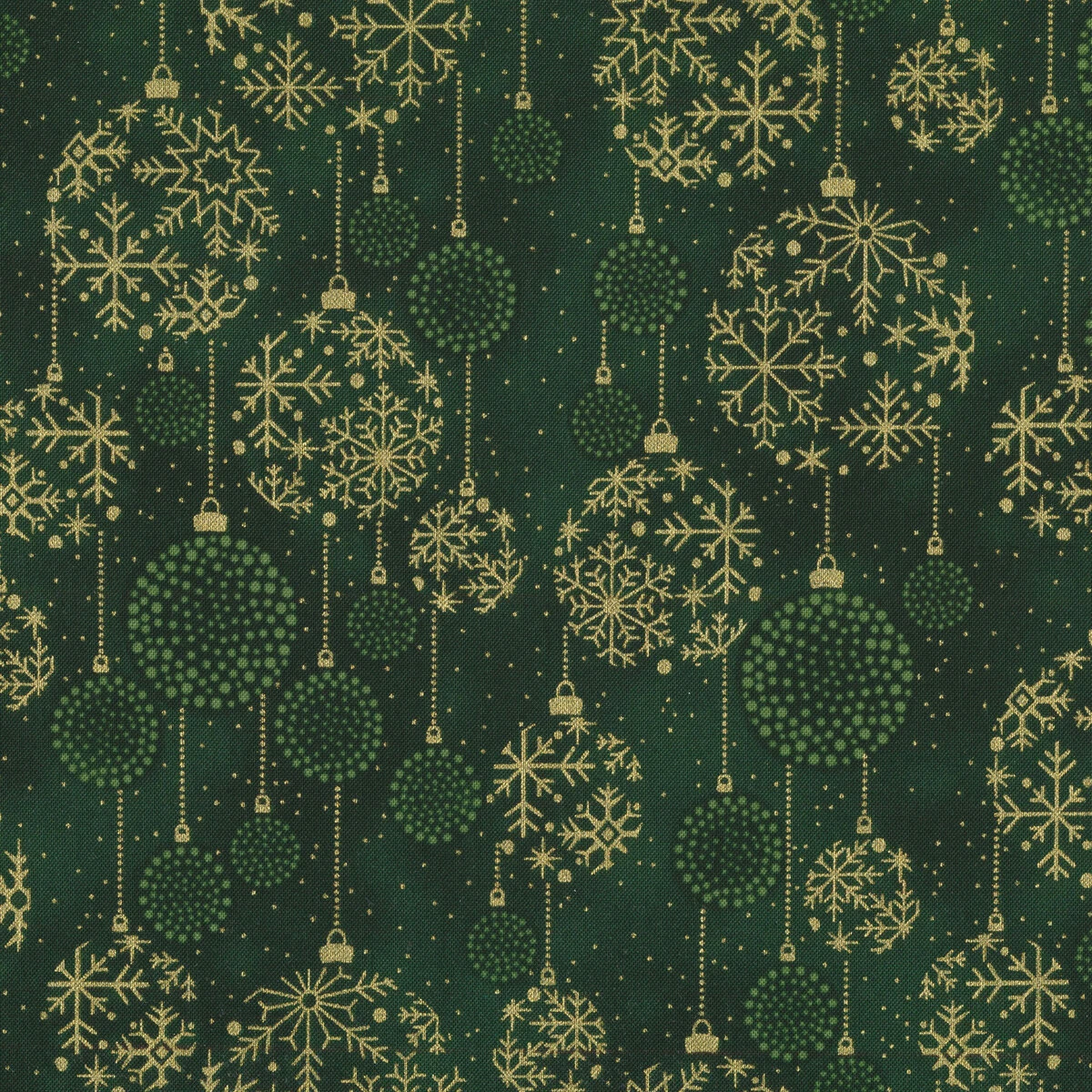 Twinkle by Stof Fabrics is another beautiful addition to the Stof Christmas line which features gold metallic accented Christmas prints with leaves, vines, snowflakes, stars, and more, all in traditional blue, green, and red colors. This fabric features gold metallic ornaments on a dark green mottled background.
